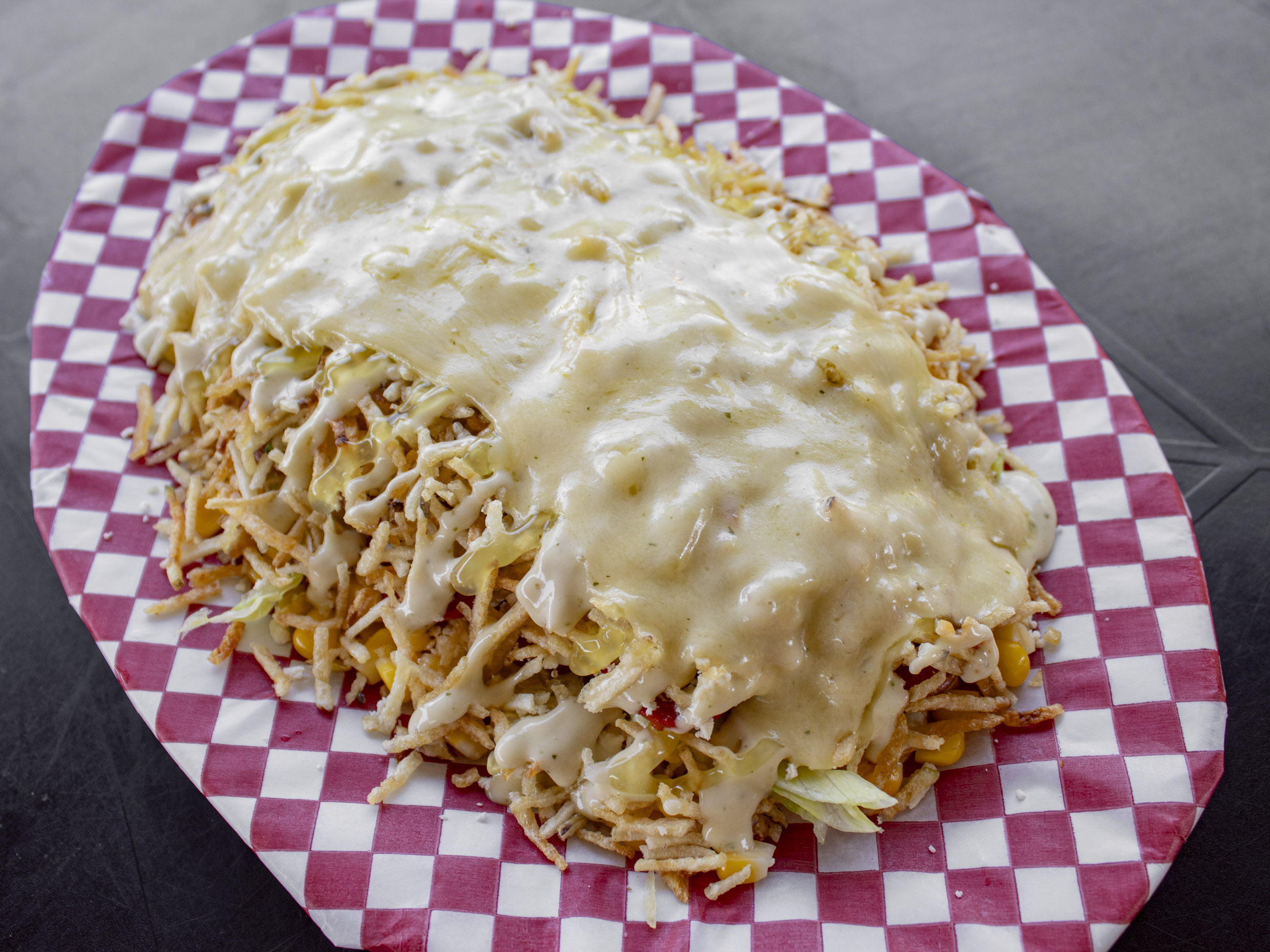 Maíz tierno, mozarela, queso costeño, lechuga, papa chongo, salsa tartara y salsa piña
