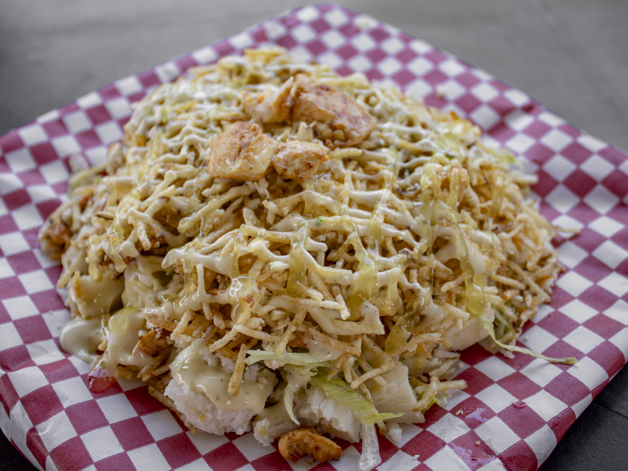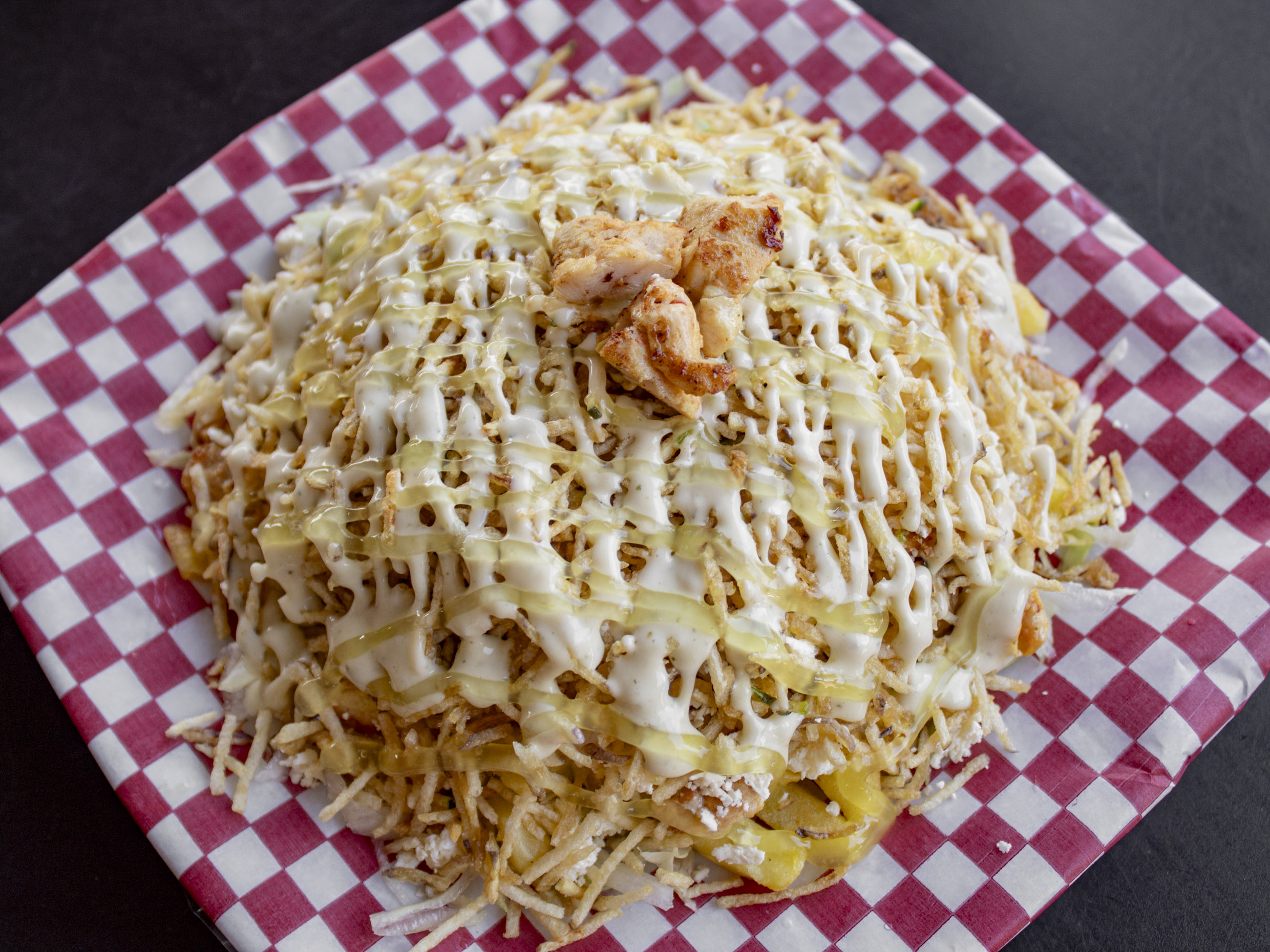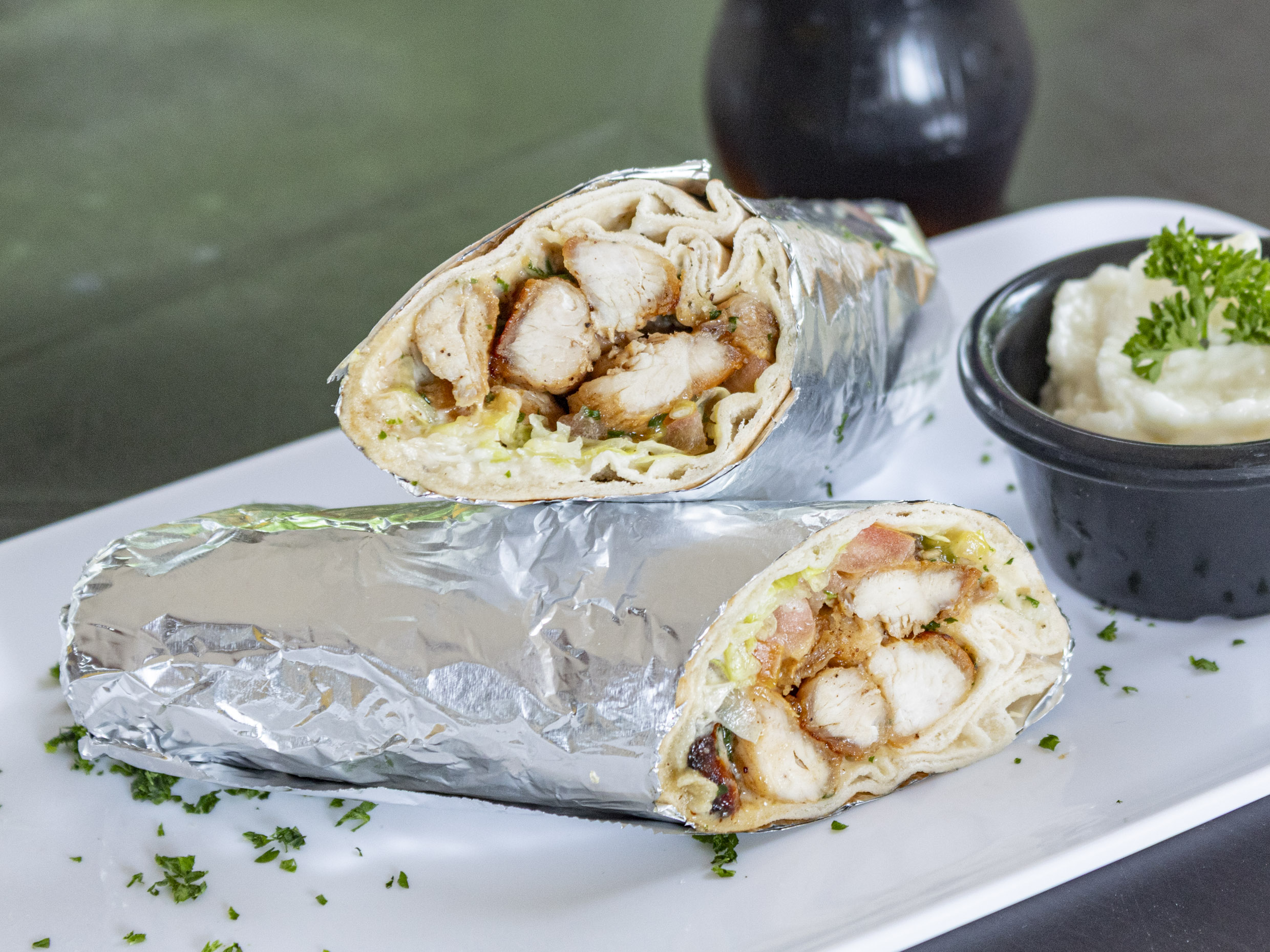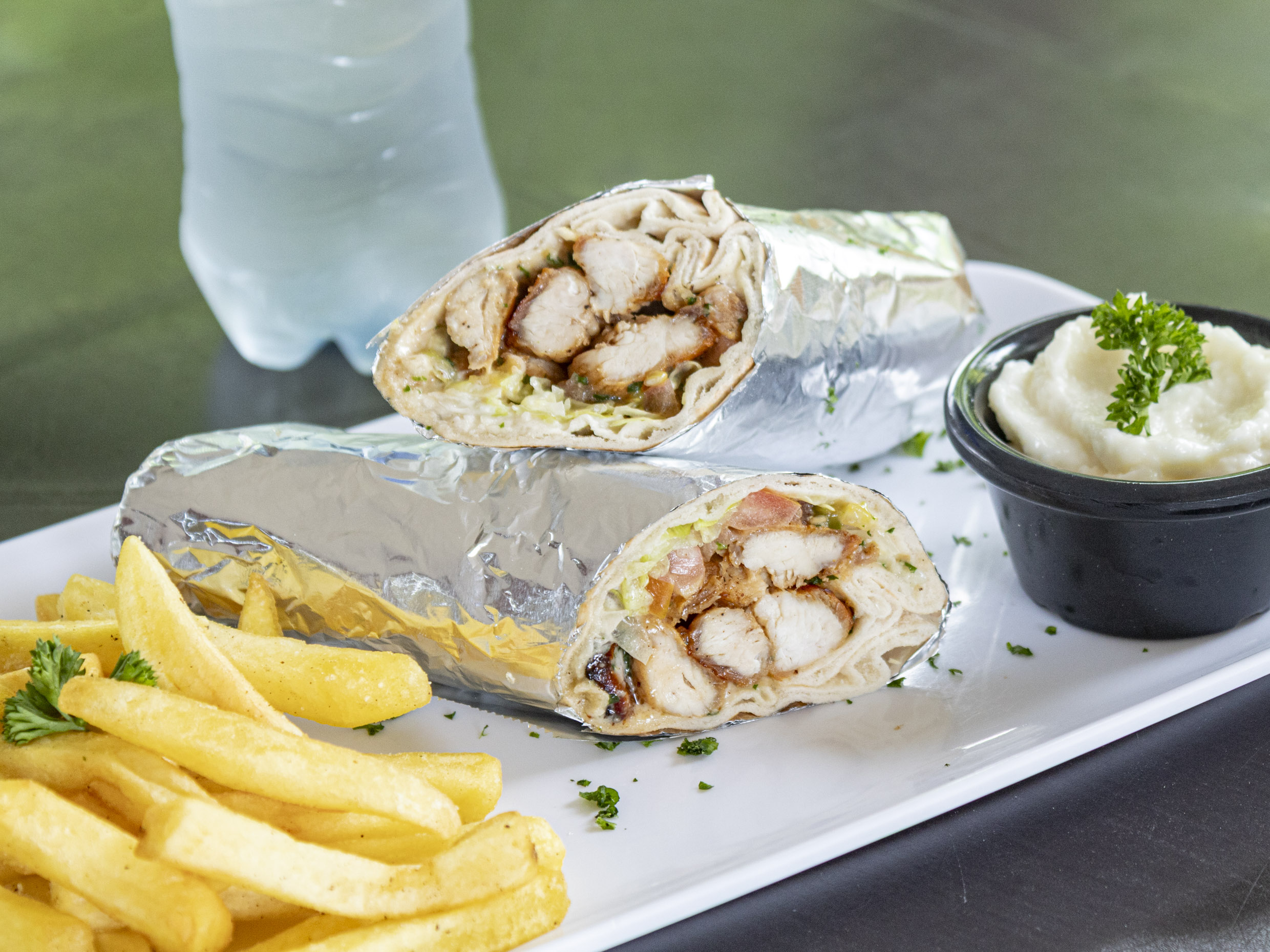 Shawarma de pollo en pan árabe con lechuga, tomate, salsa de ajo, perejil, salsa tahine, papas fritas y salsa de ajo 1oz más agua.