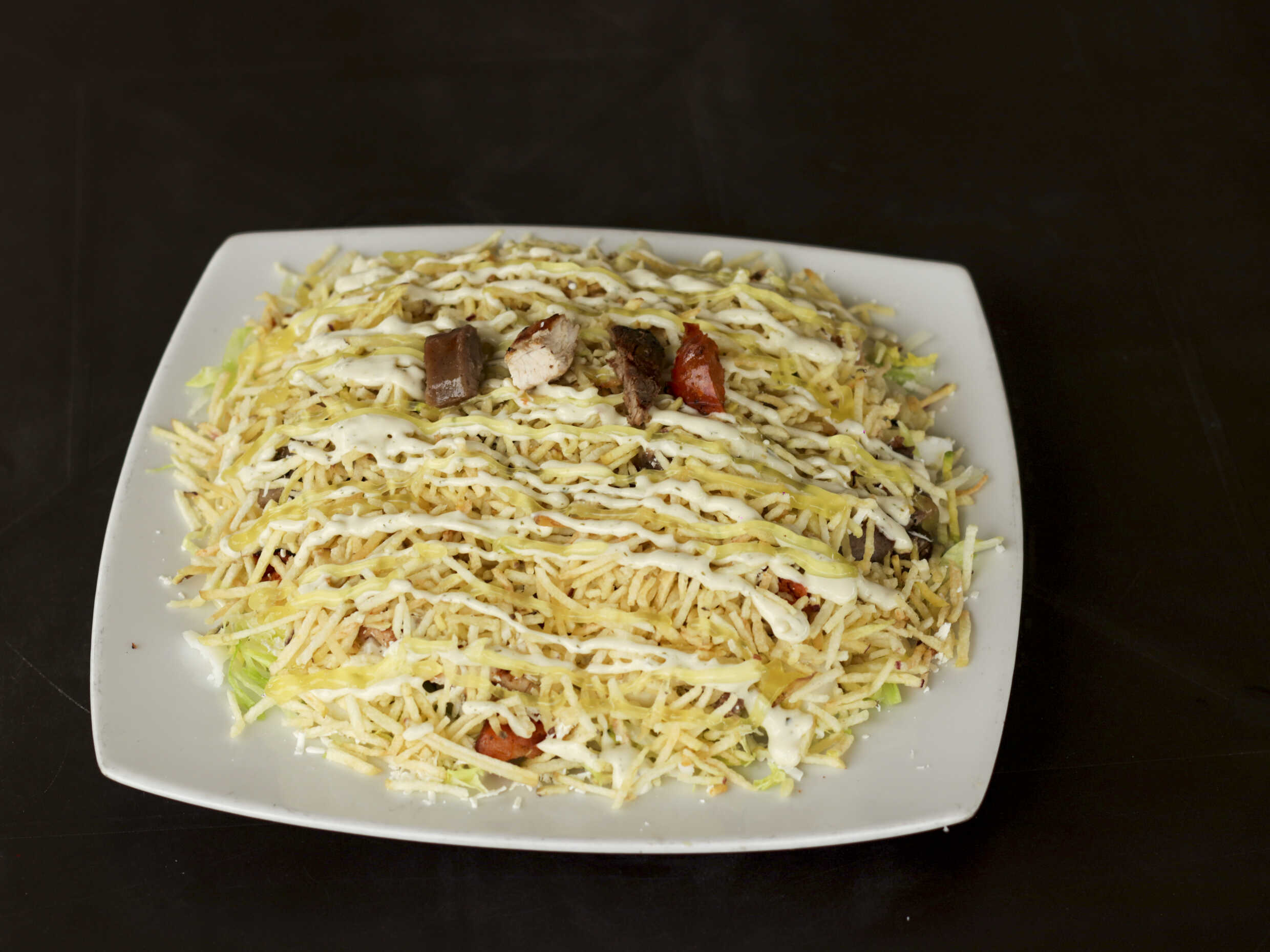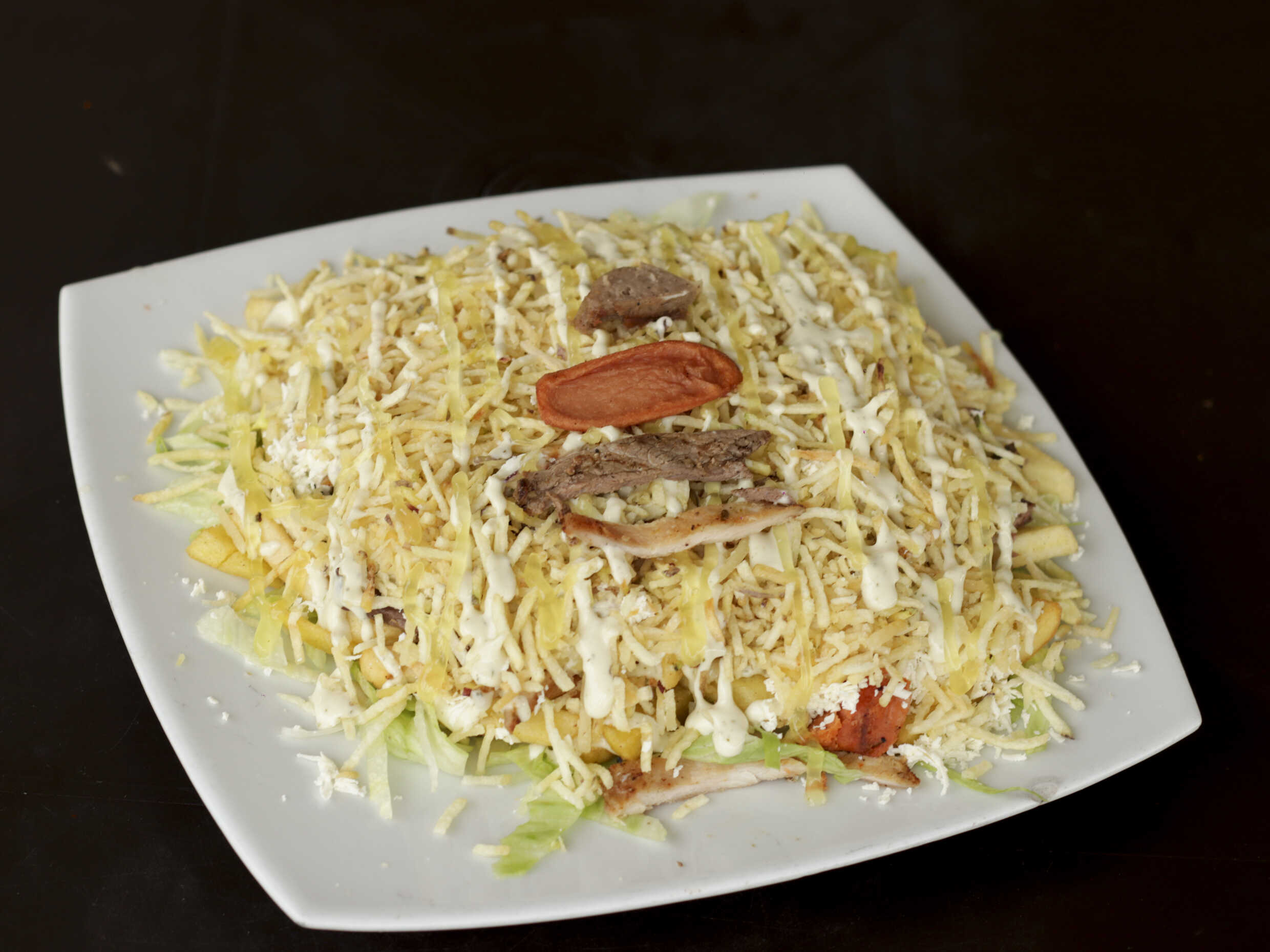 400 g De papa francesa, carne, pollo, chorizo, butifarra, salchicha manguera, lechuga, papa chongo, queso costeño, salsa tártara y salsa piña