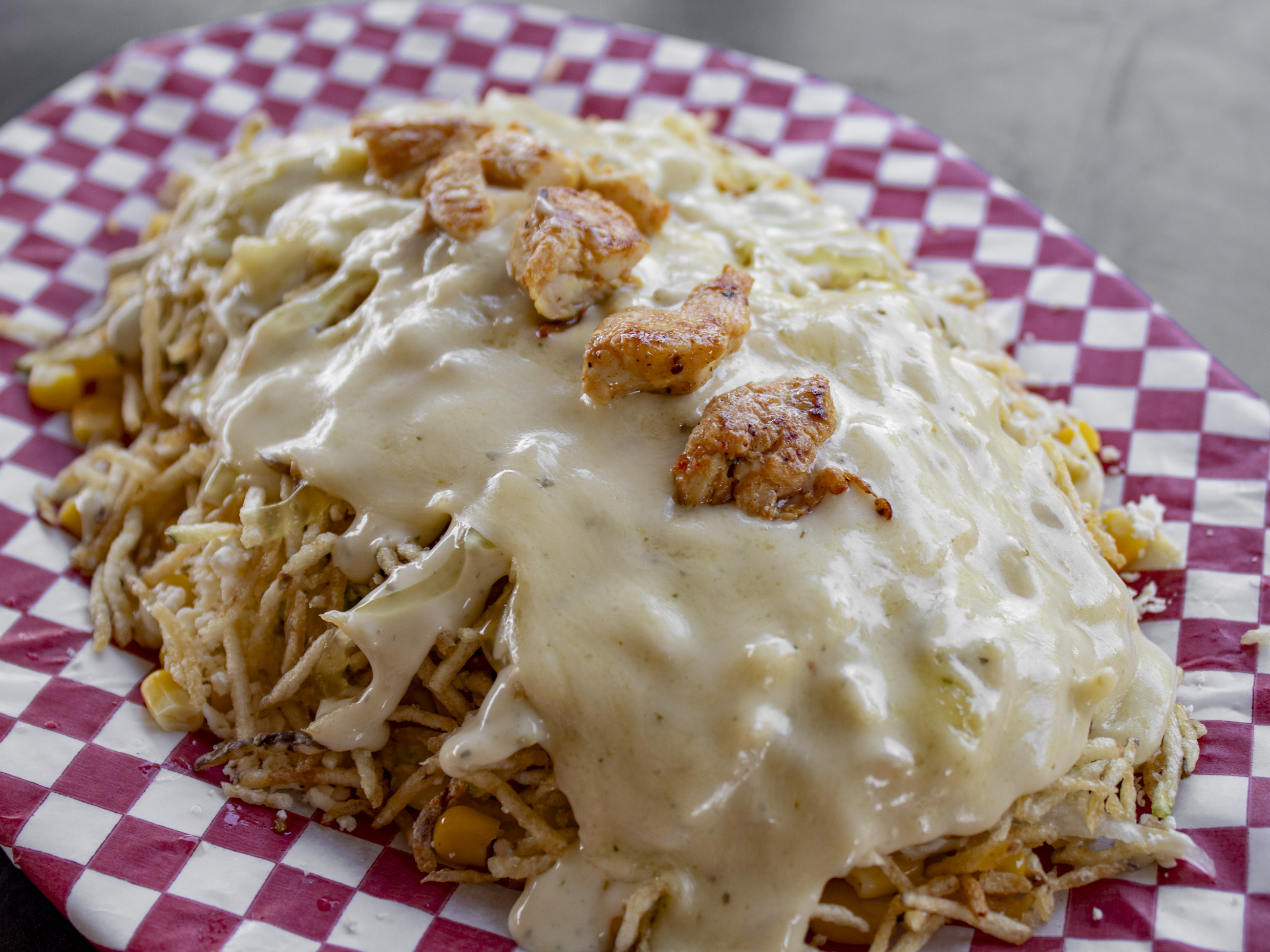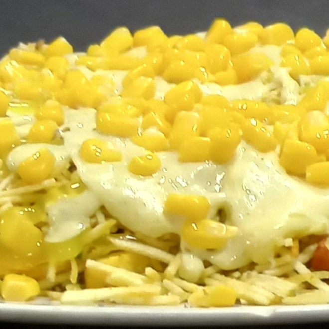 Maíz tierno, pollo, mozarela, lechuga, papa chongo, queso costeño, salsa tartara y salsa piña