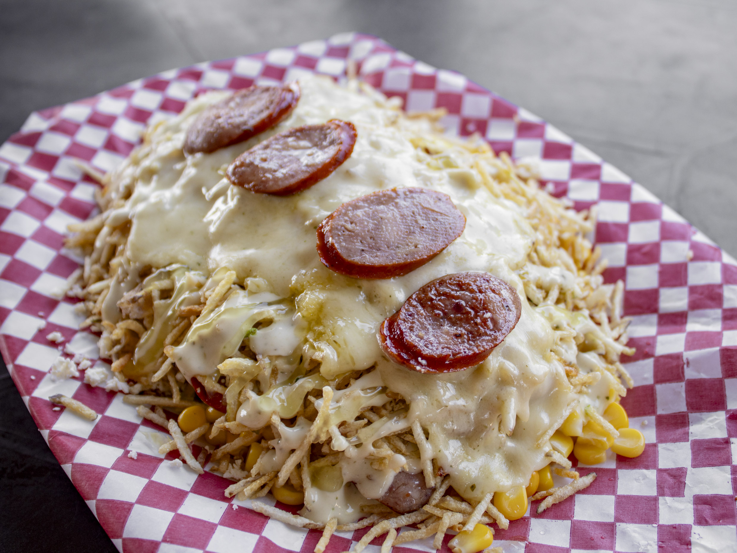Maíz tierno, chorizo, mozzarella, lechuga, papa chongo, queso costeño, salsa tartara y gel de piña.