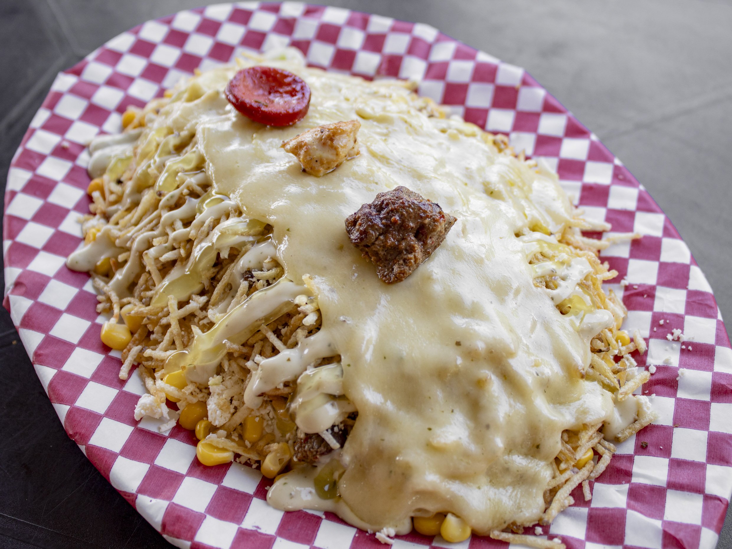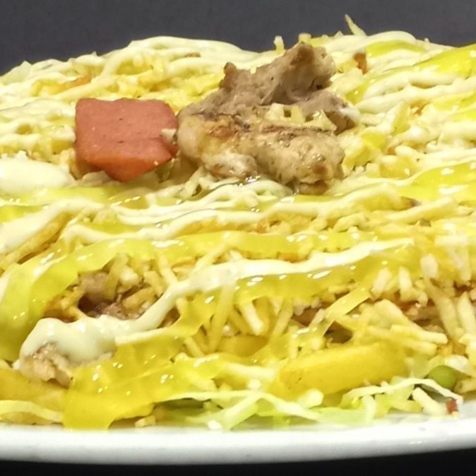 Carne, pollo, chorizo, butifarra, maíz, mozarela, queso costeño, papa chongo, lechuga, salsa tártara y salsa piña