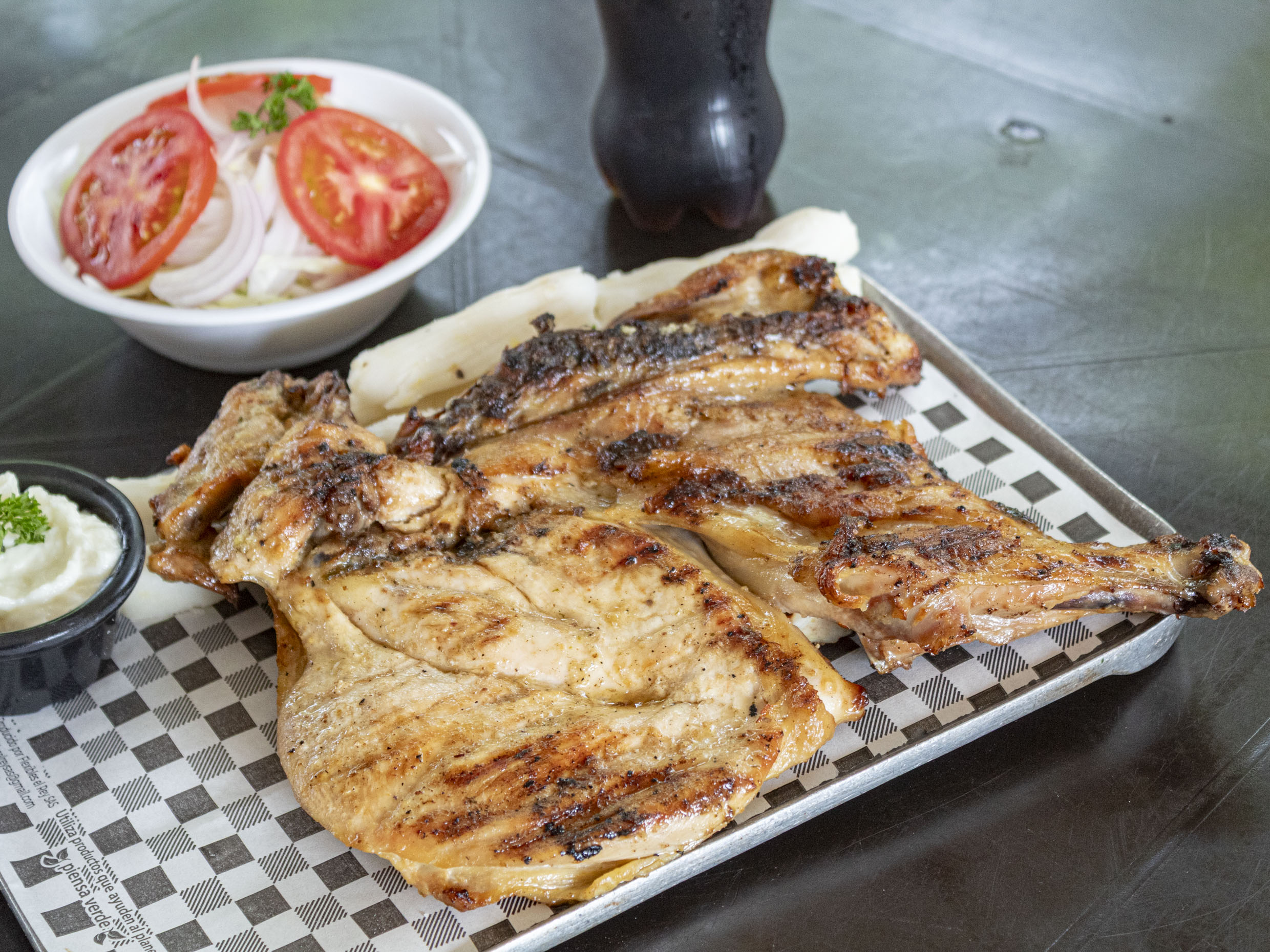 Pechuga de 300 gr asado, acompañada de yuca, una onza de salsa de ajo, ensalada de lechuga, cebolla y tomate