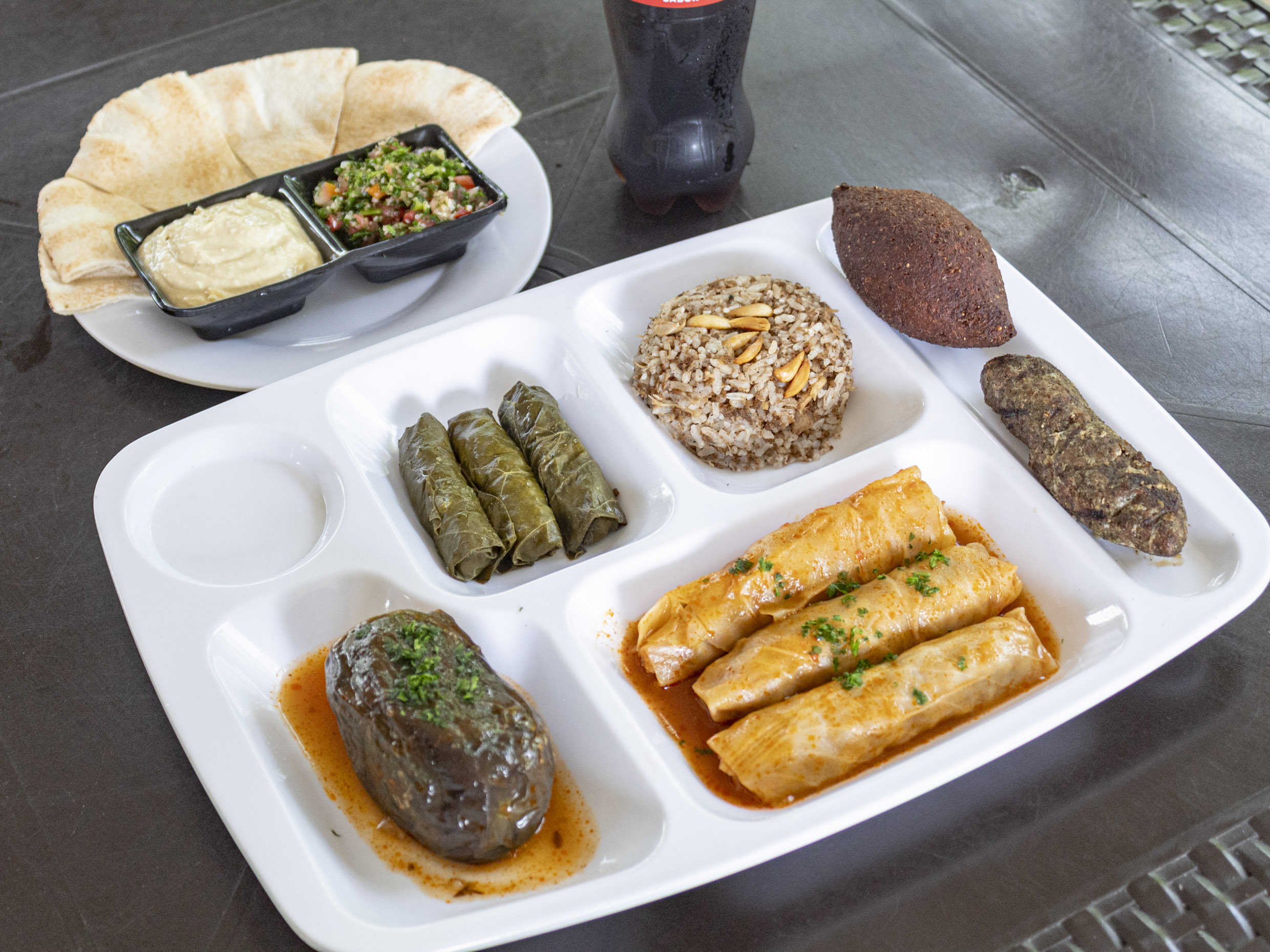 Arroz de almendra, 1 quibbe, 1 kaffta, 1 berenjena, 3 parras, 3 repollos, tabbule, tahine, 1 pan árabe más gaseosa.