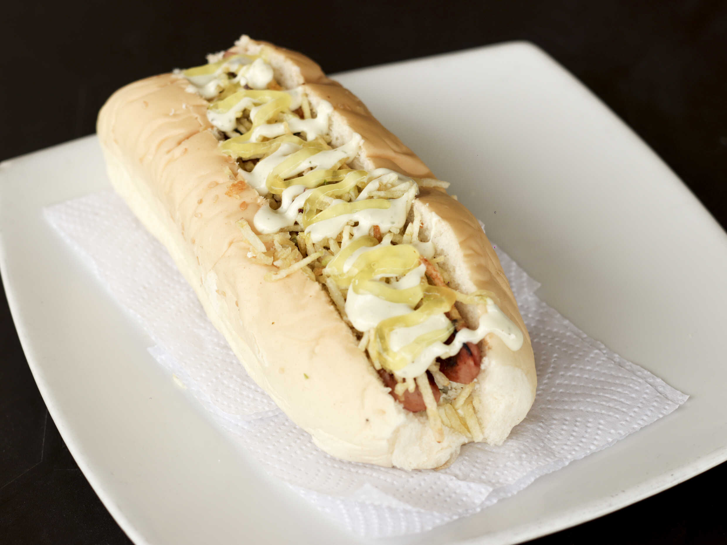 Doble pan, chorizo, butifarra, pollo, tocineta, mozarela, queso costeño, papa chongo, lechuga, salsa tártara y salsa piña