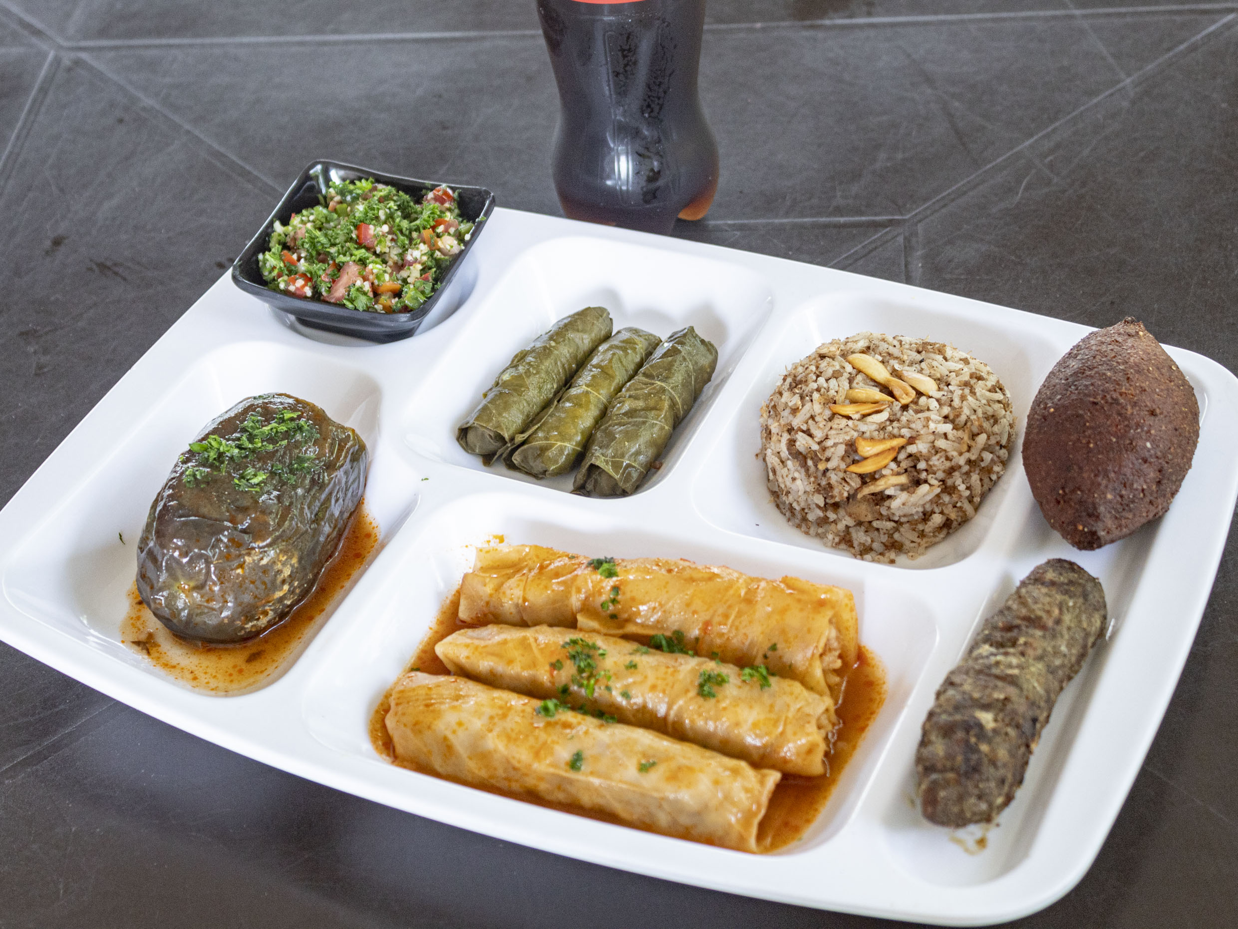 Arroz de almendra, 1 quibbe, 2 parras, 2 repollos, 1 berenjena, tabule y una kaffta más gaseosa.