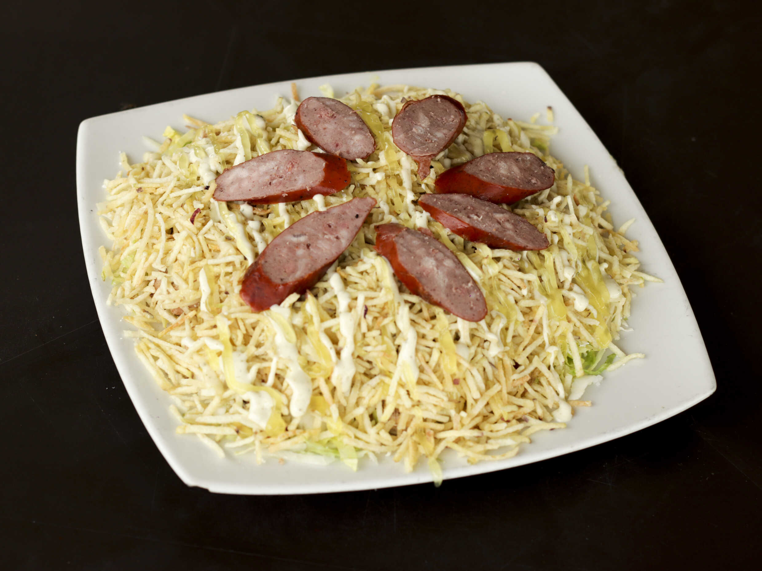 Papa, salchicha, chorizo, butifarra, lechuga, queso costeño, papa chongo, salsa tartara y salsa piña