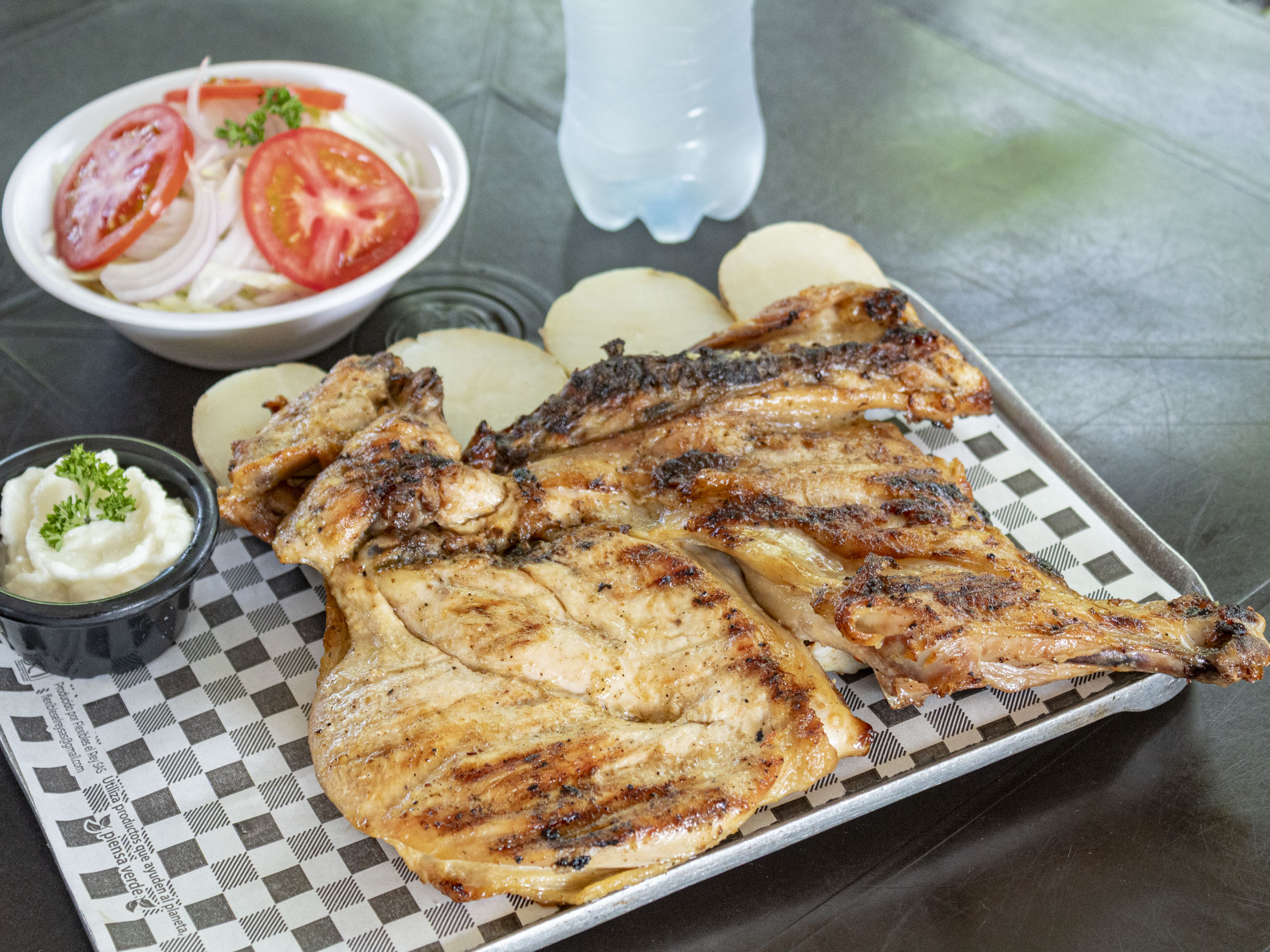 Acompañado con papa cocida, salsa de ajo de una onza, ensalada de lechuga, cebolla y pepino o tomate más agua.