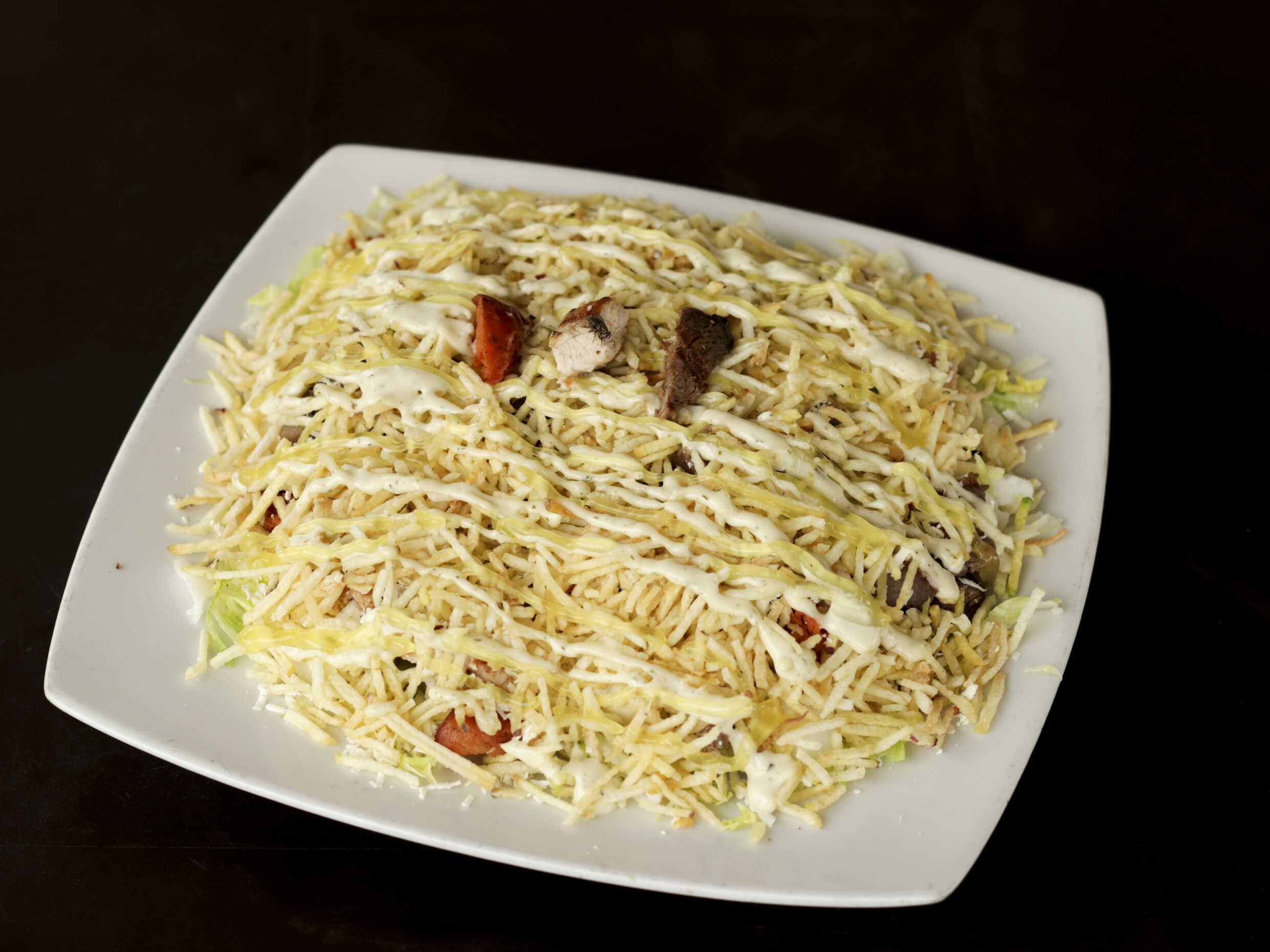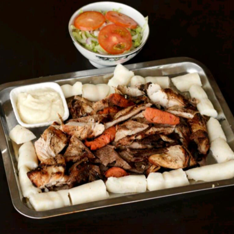 Shawarma pan árabe con carne, pollo, lechuga, tomate, salsa de ajo, perejil, salsa tahine + papas francesas y salsa ajo 1 oz más agua.
