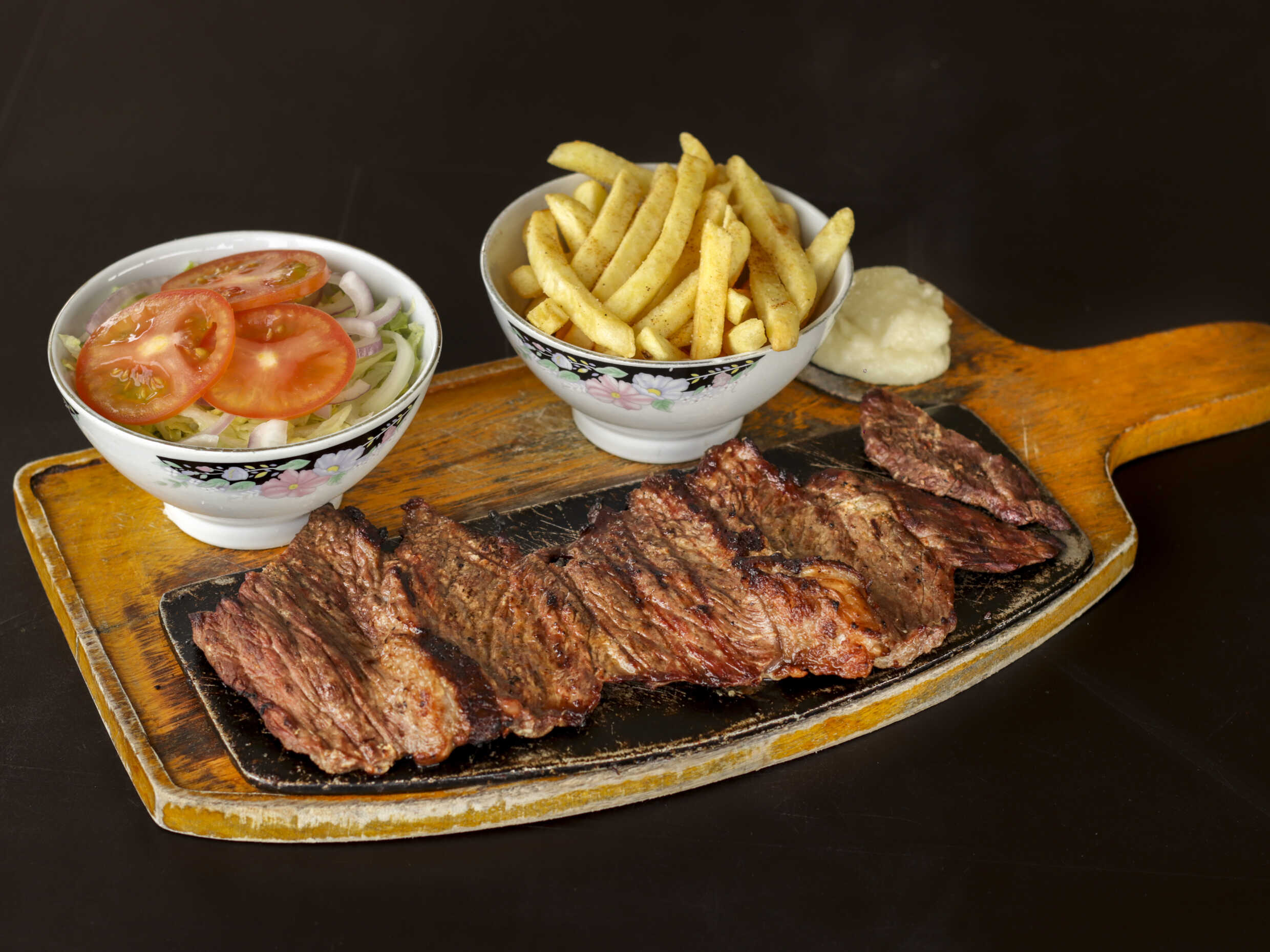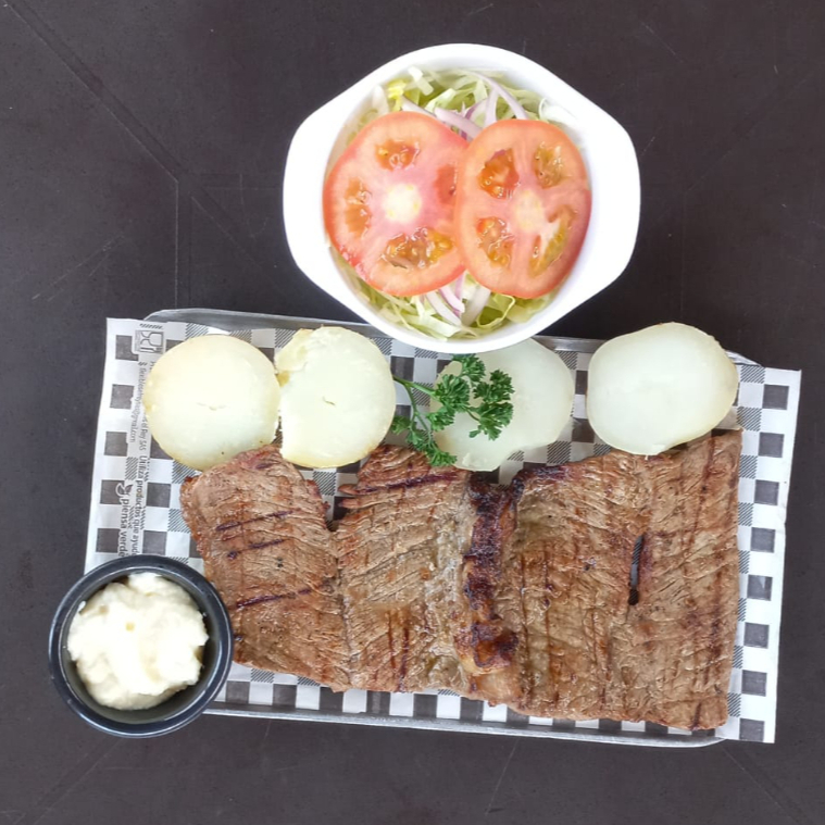 280 gr de lomo ancho acompañado de papa cocida, salsa de ajo, ensalada de lechuga, cebolla y tomate.