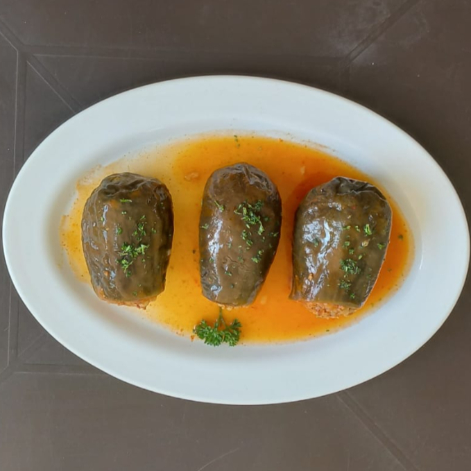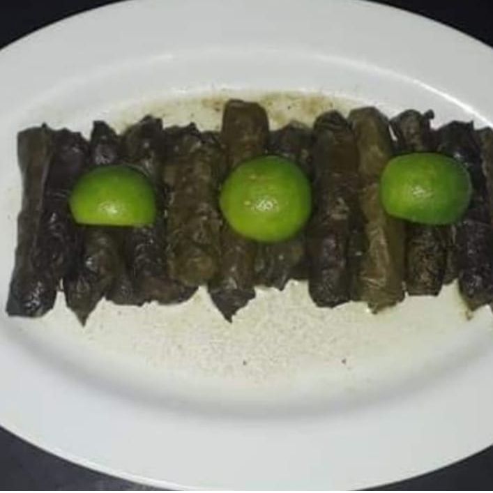 Hojas de uva rellenas de carne, arroz, especias arabe y se acompaña con limón.