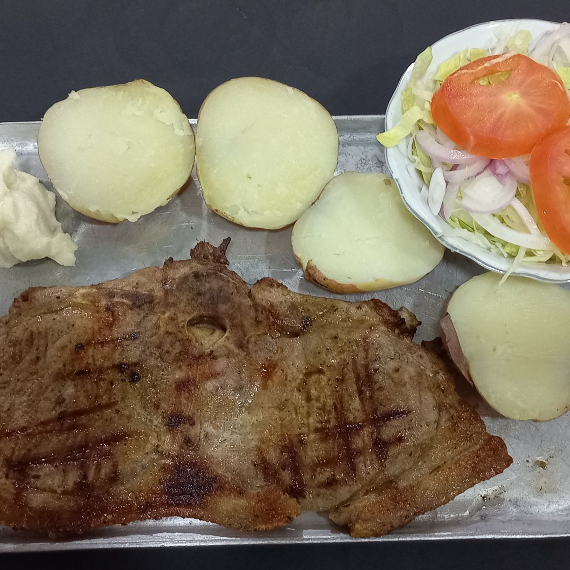 chuleta de 300 gr asada, acompañada de papa cocida, una onza de salsa de ajo, ensalada de lechuga, cebolla y tomate