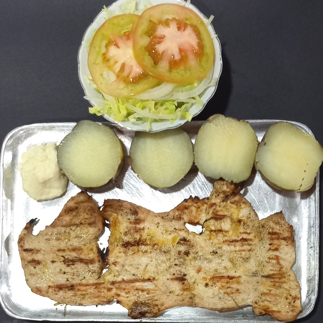 Filete de pechuga de 300 gr acompañada de papa cocida, salsa de ajo de una onza, ensalada de lechuga, cebolla y tomate.
