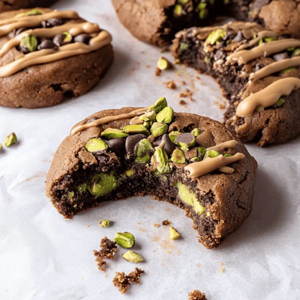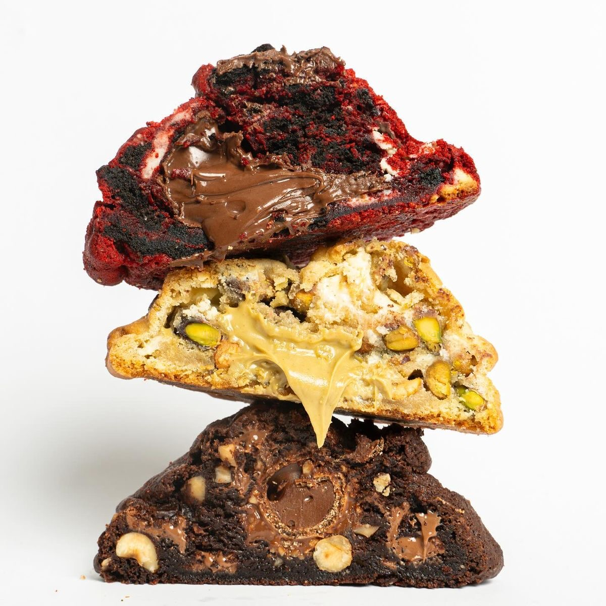 Galleta estilo new york de chocolate con relleno cremoso de pistacho y chocolate blanco.