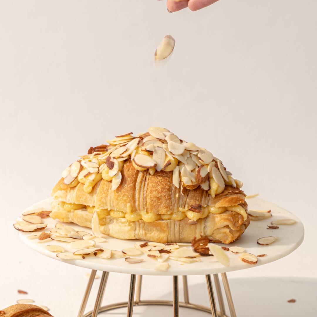 Croissant relleno con crema de almendras y almendra tajada por encima.