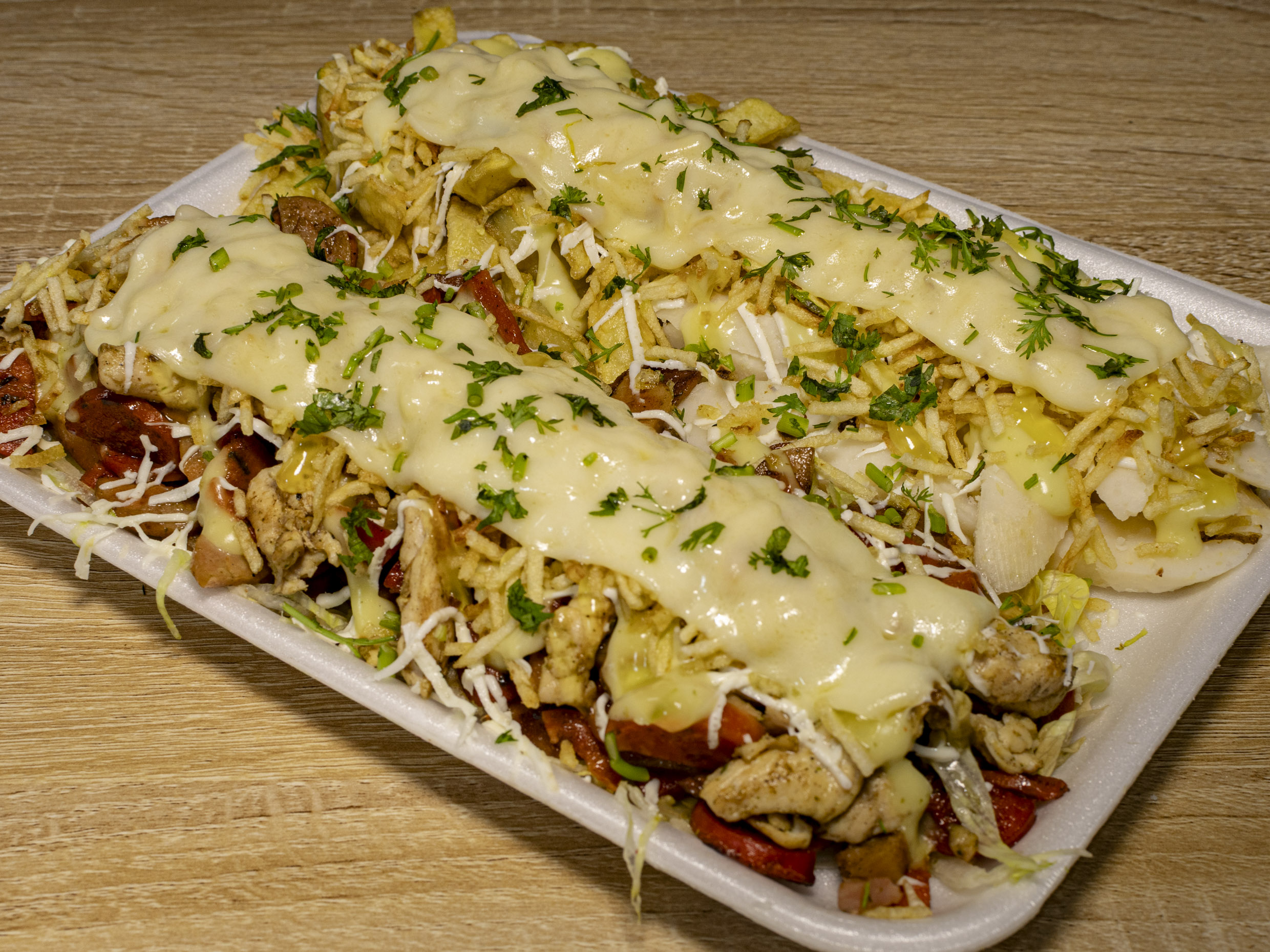Trae: Pollo, Chorizo, Butifarra, Mozarrella, Bollo, Papas Fritas.