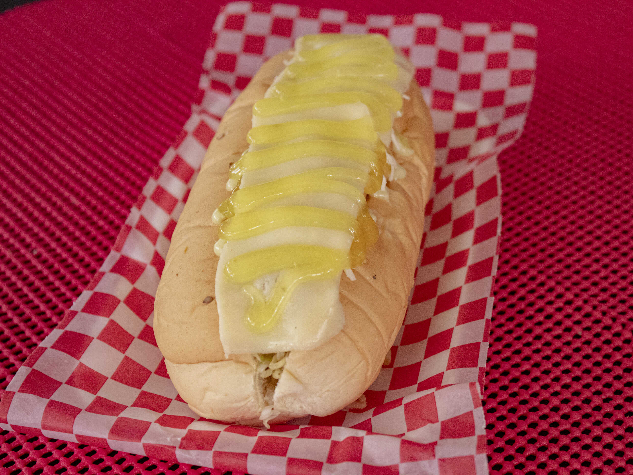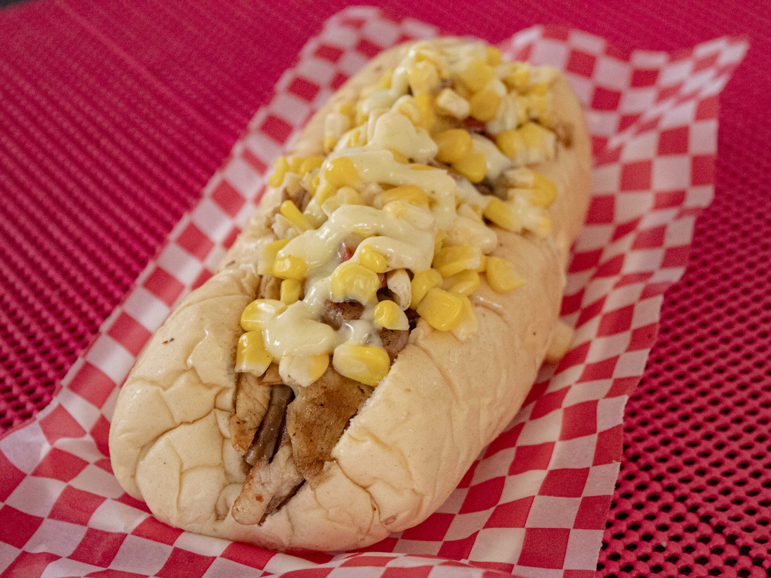 Pan casero, salchicha americana, queso costeño, chongo lechuga y queso mozzarella.