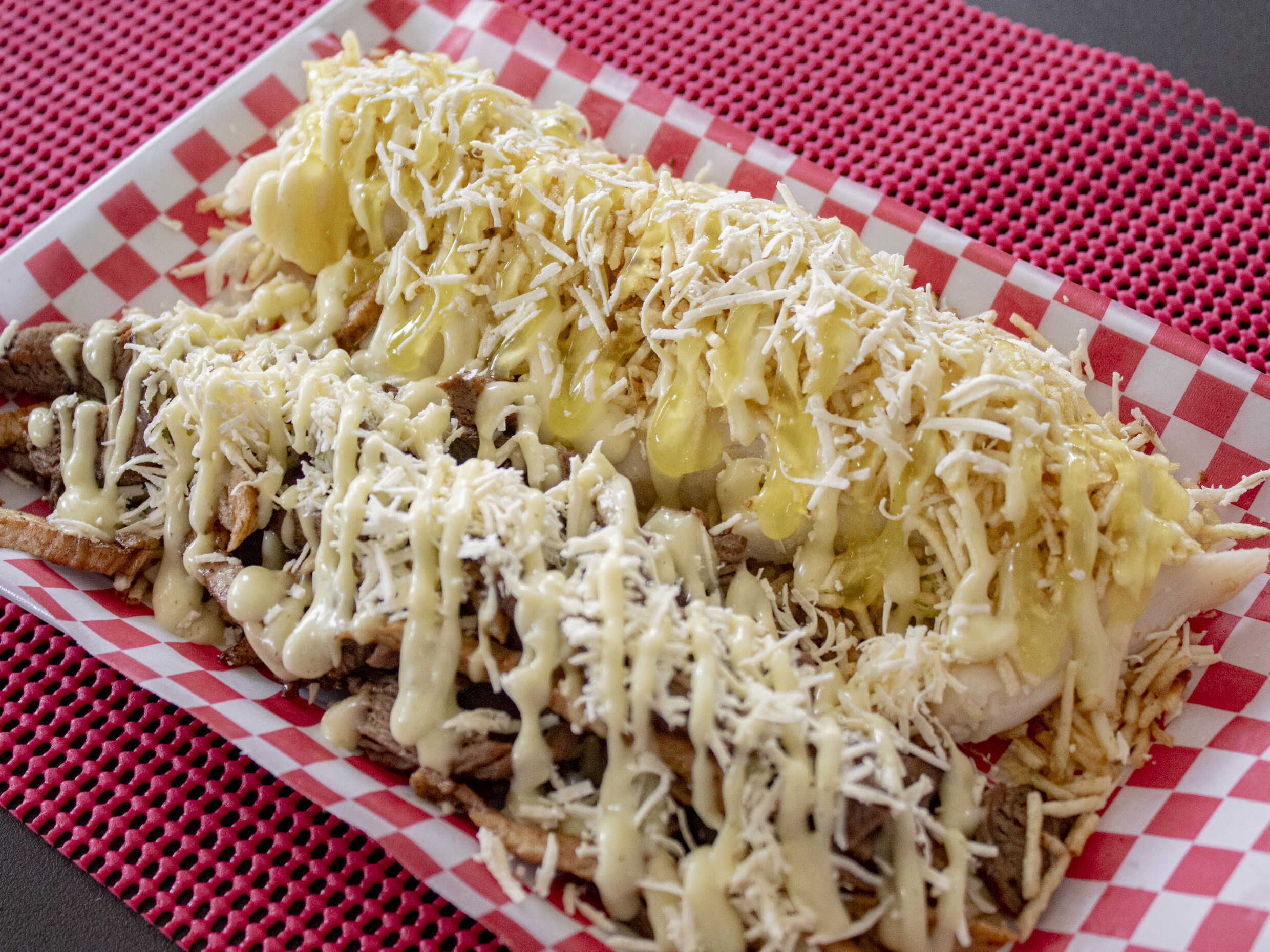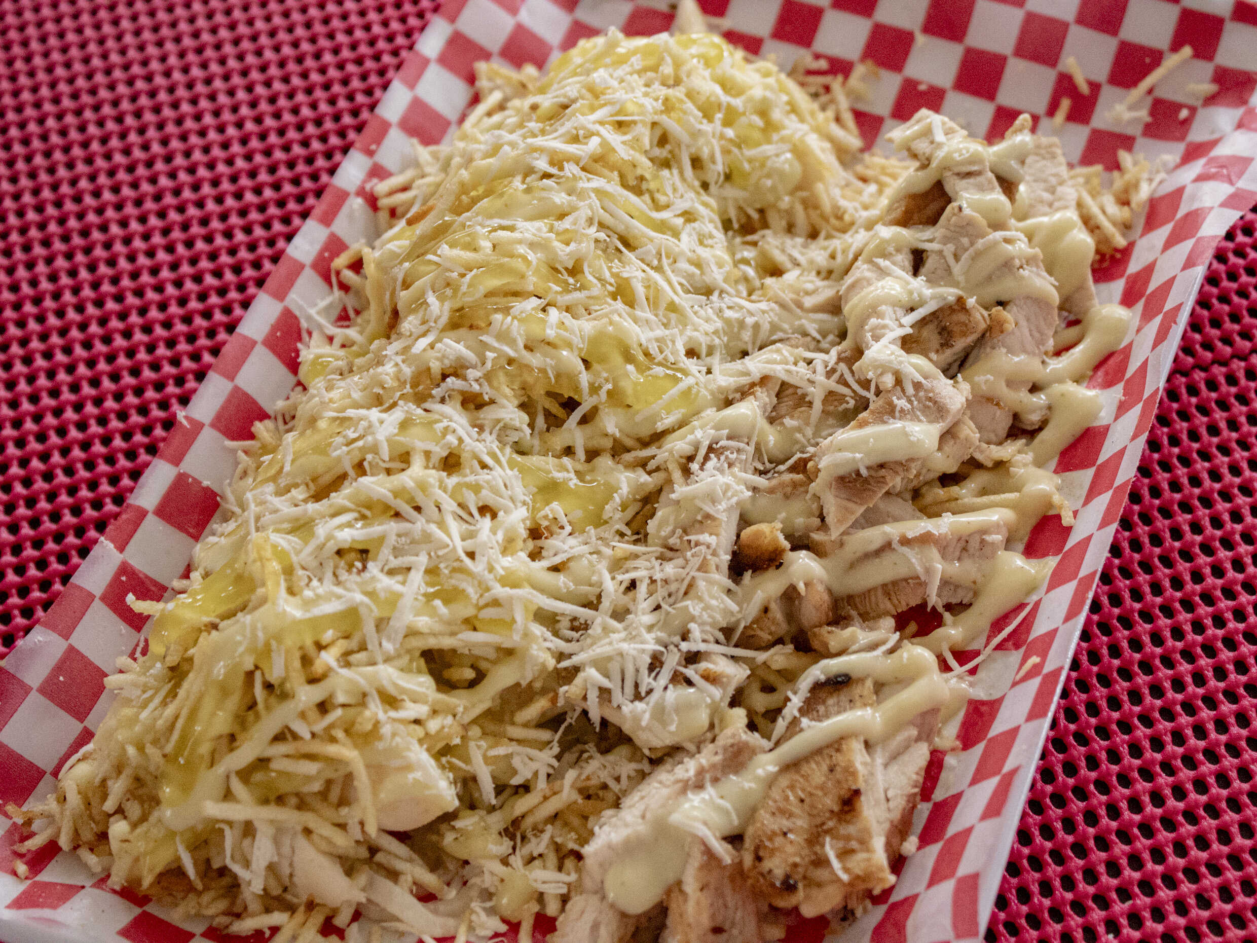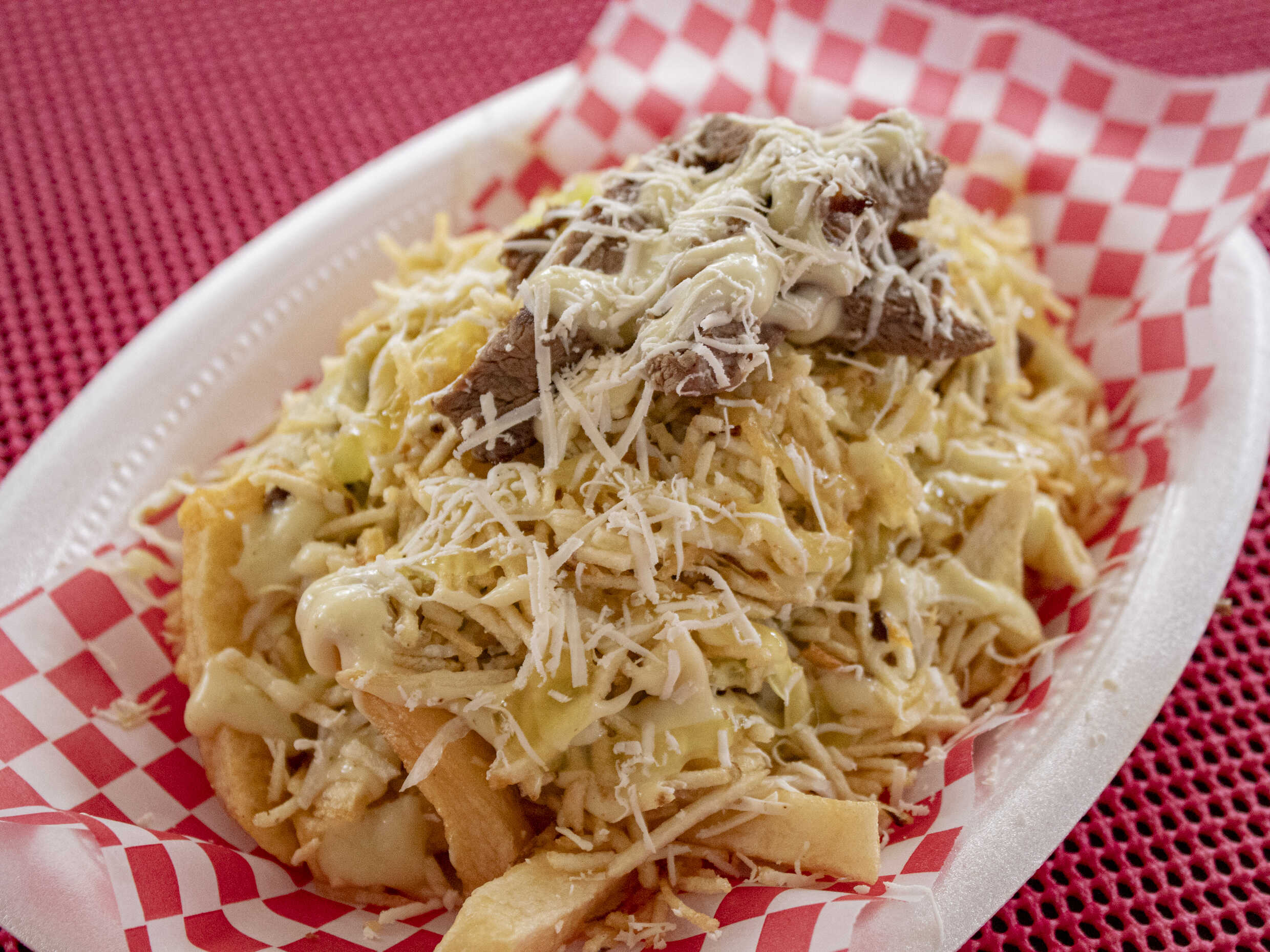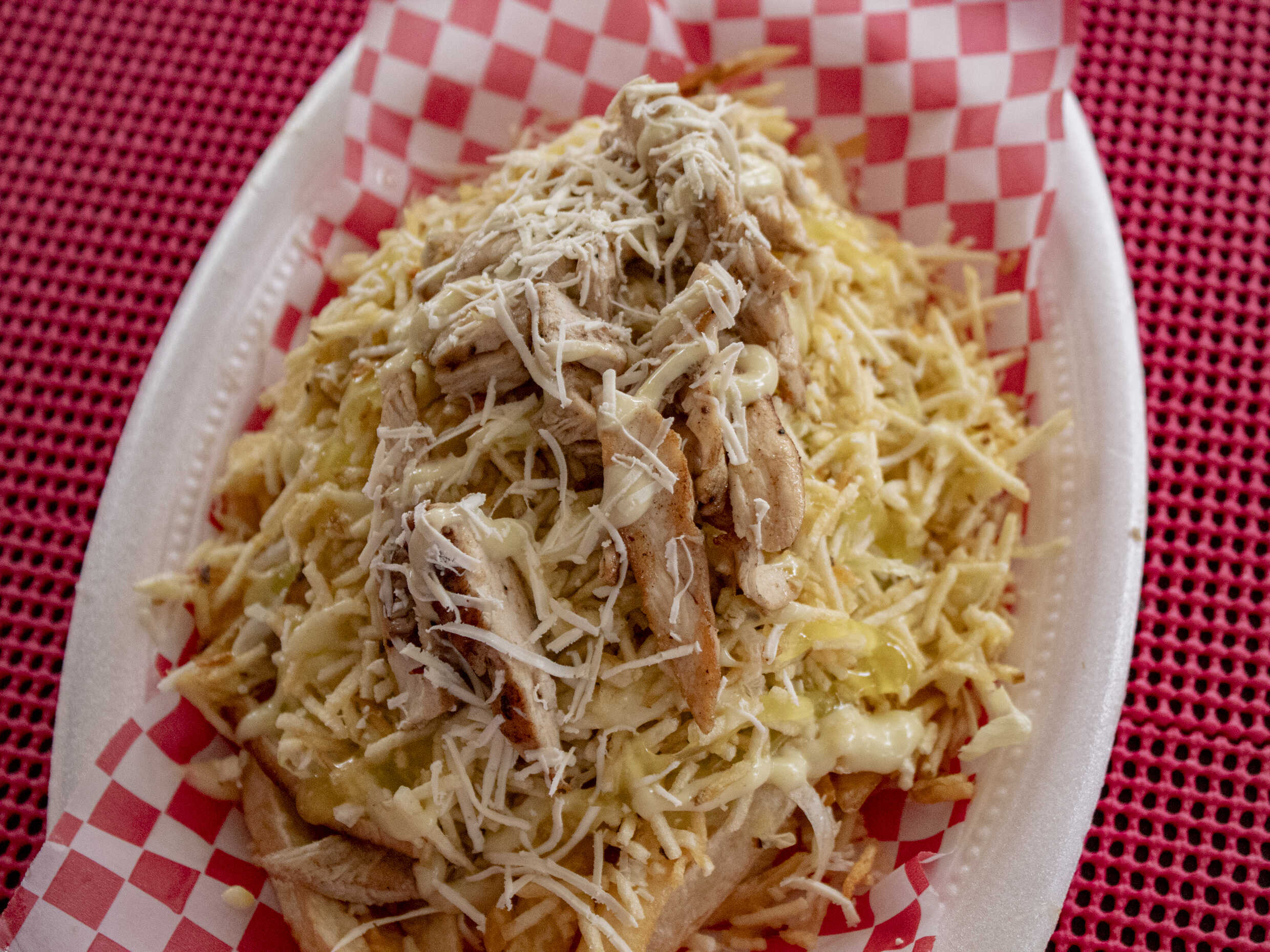 Papas a la francesa, trocitos de pollo, salchicha suiza y queso mozzarella.