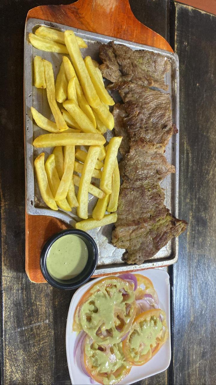 Carne asada, papas a la francesa y ensalada (lechuga, tomate, cebolla).