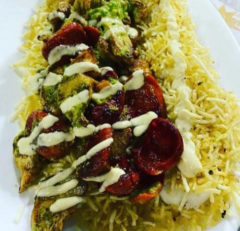 Pollo, a la francesa, butifarra, chorizo, queso costeño, lechuga y chongo.