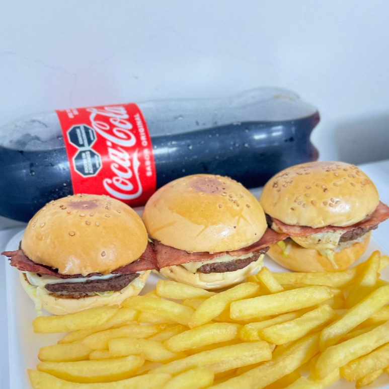 Trae: 3 Mini Burger, Tocineta o Jamon, Mozarrella, Carne artesanal, Gaseosa 1,5lt