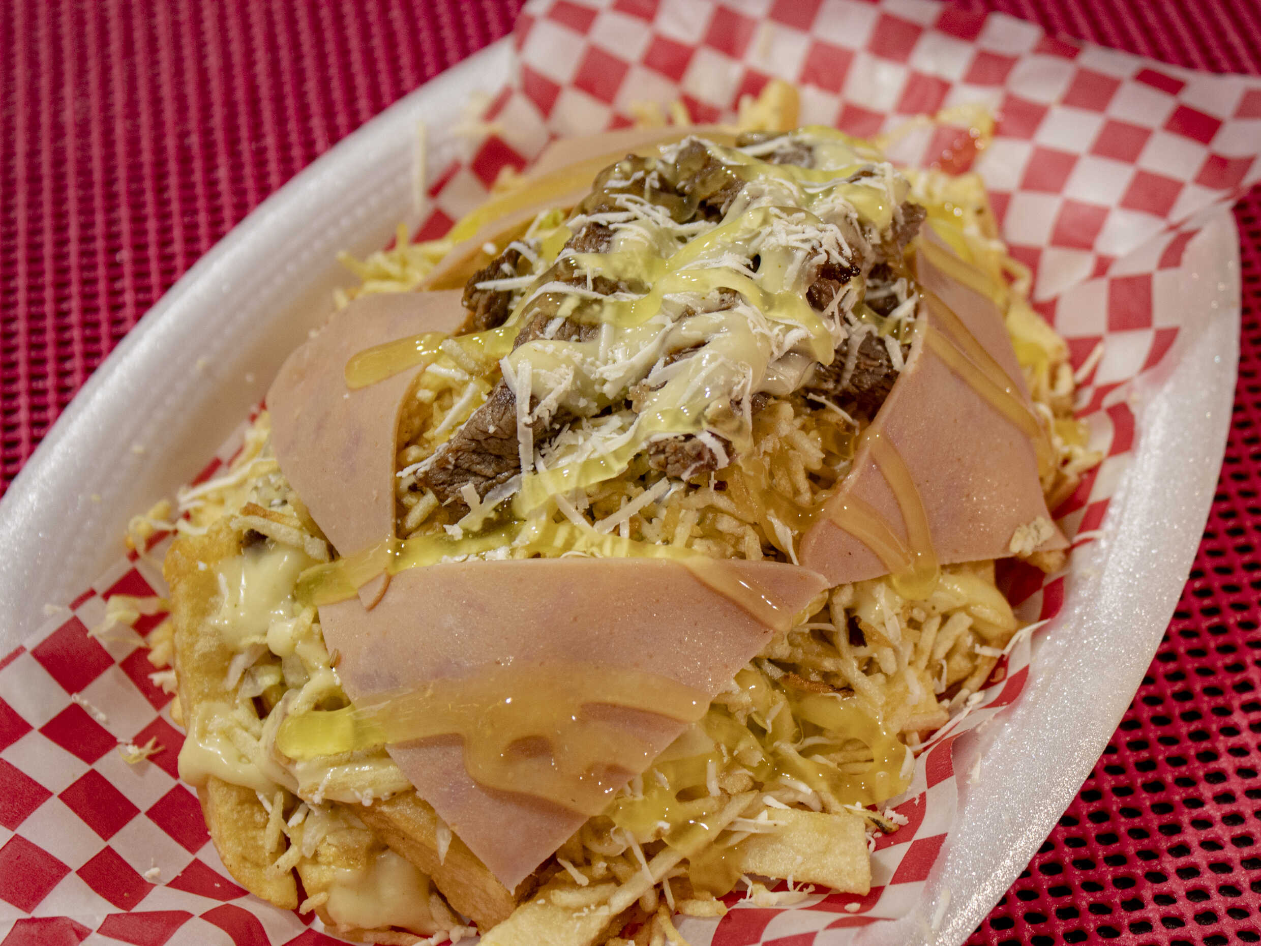 Papas a la francesa, pollo, chorizo, butifarra, queso costeño, lechuga, chongo y queso mozzarella.