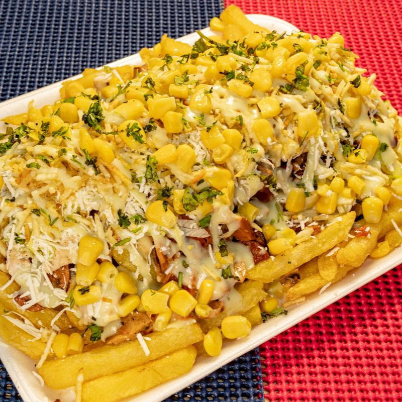 Papas a la francesa, trocitos de pollo, salchicha suiza y queso mozzarella.