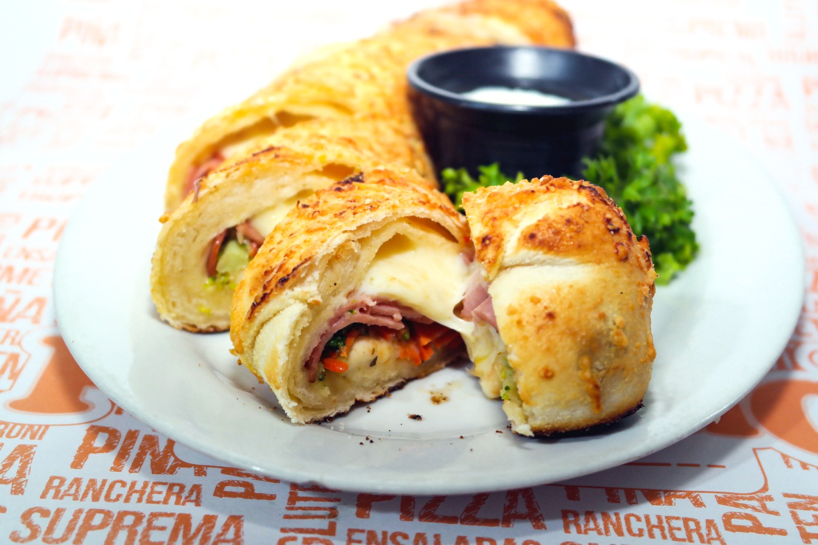 Masa de harina, queso mozzarella, salsa napolitana, pollo, carne molida, suiza, butifarra, chorichuzo, pepperoni americano, tocineta, papa chongo, salsa tártara
