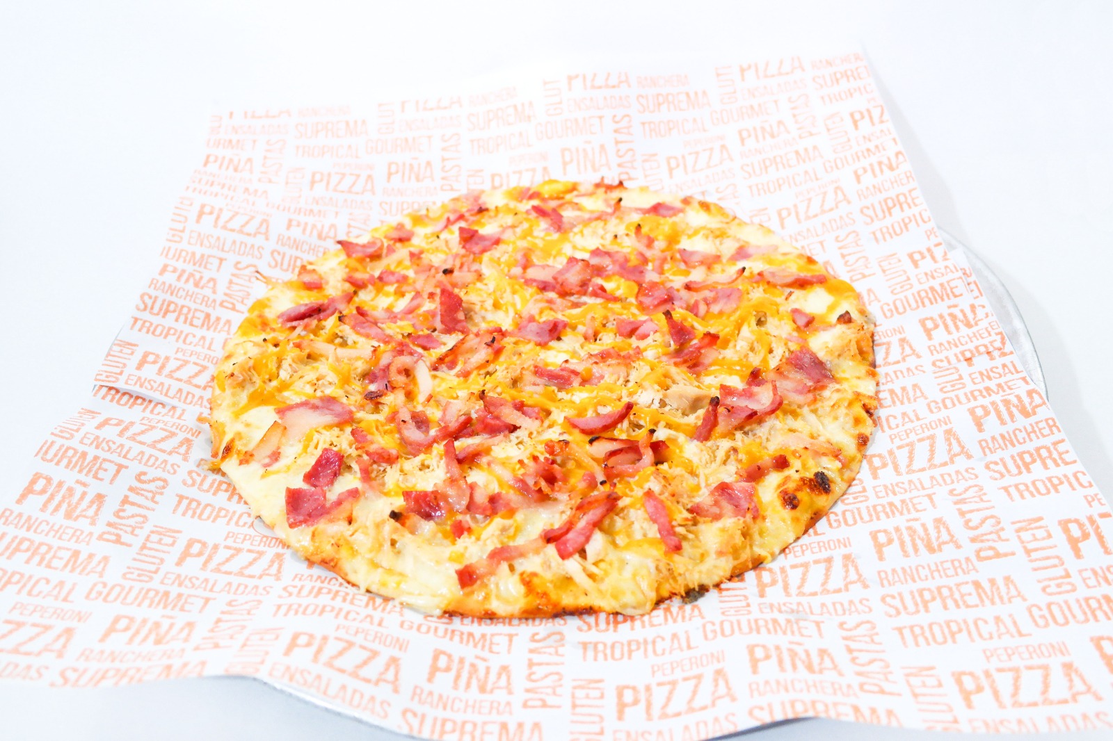 Masa de harina, queso mozzarella, salsa napolitana, pollo en salsa BBQ, piña, tocineta sofrita.