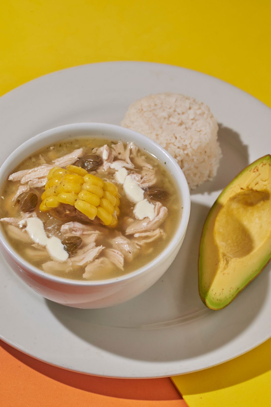 Sopa de pollo y vegetales acompañada de arroz blanco y limón