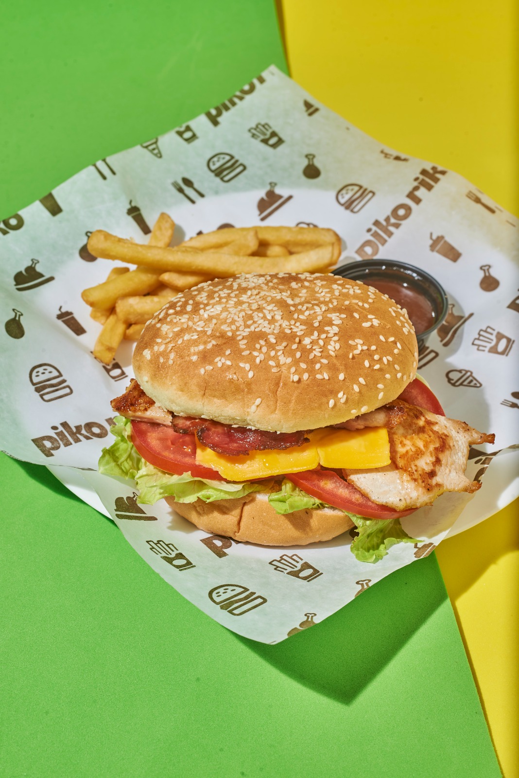 Hamburguesa de filete de pechuga asada o apanada, tocineta, queso mozzarella, lechuga y tomate, papas a la francesa (150gr), gaseosa Postobón 250ml (Sabor sujeto a disponibilidad)