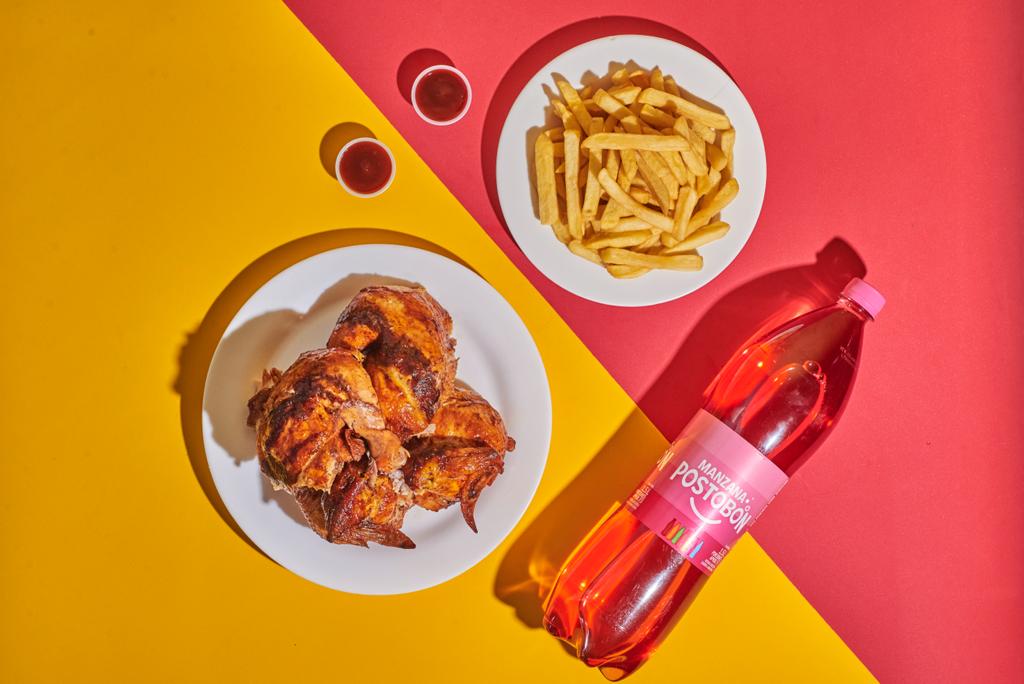 Combo Pollo Asado Entero (8 presas), acompañado de papas a la francesa (200gr) y gaseosa Portobón 1.5 Lt (Sabor sujeto a disponibilidad).
