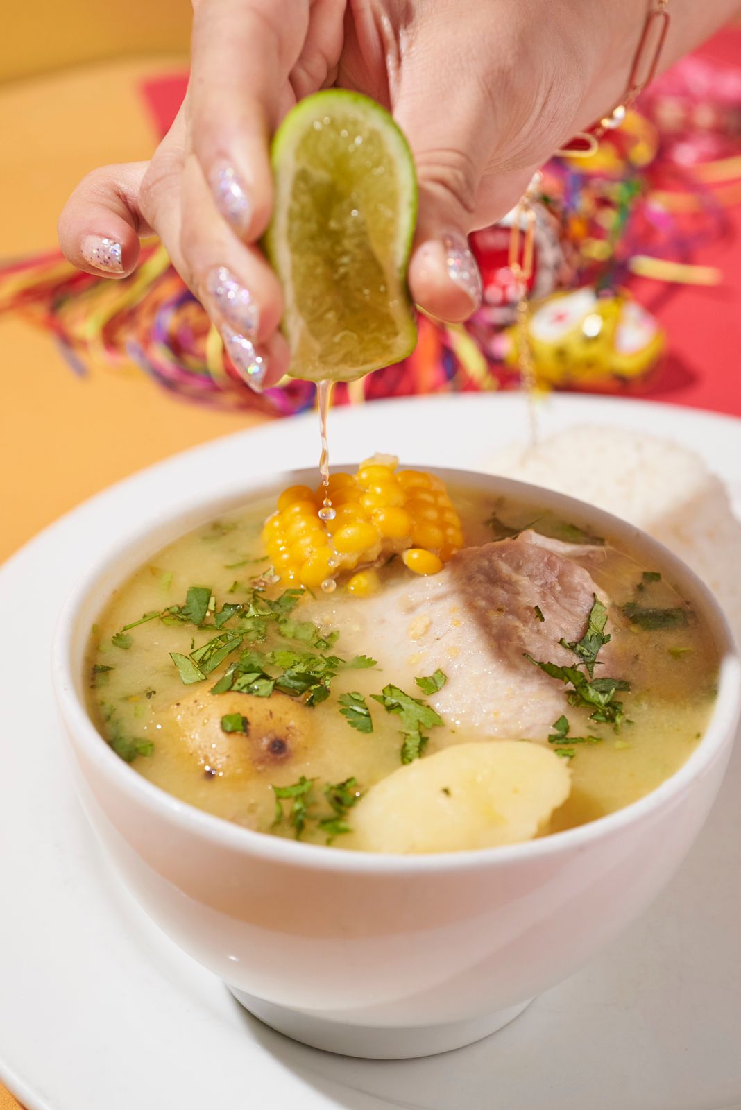 Sopa de pollo y vegetales acompañada de arroz blanco y limón