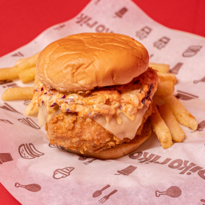 Hamburguesa de pechuga apanada, cebolla caramelizada acompañada de papa francesa
