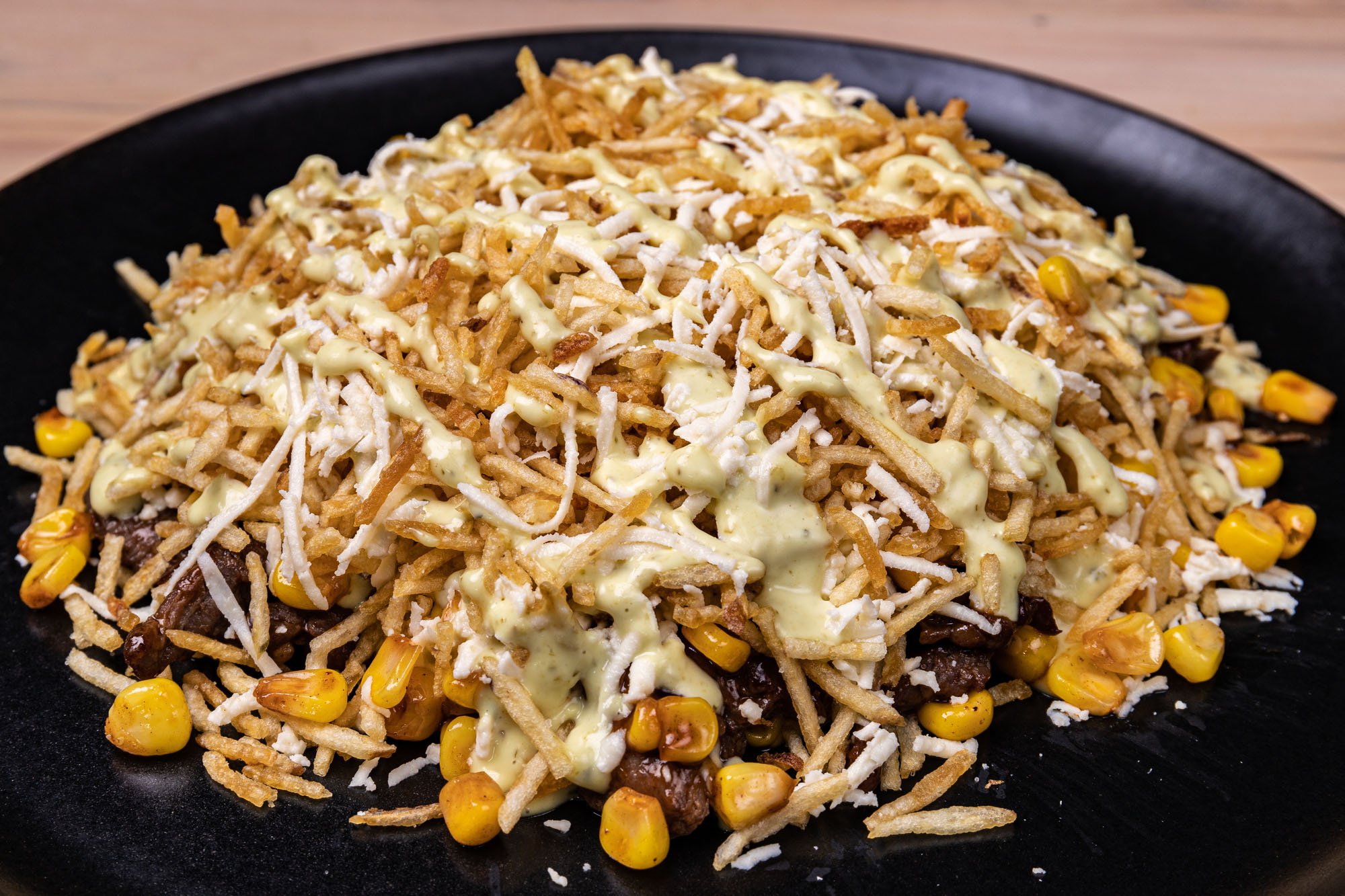 Maíz, carne en trozos, queso costeño, lechuga, salsa tartara y salsa piña.