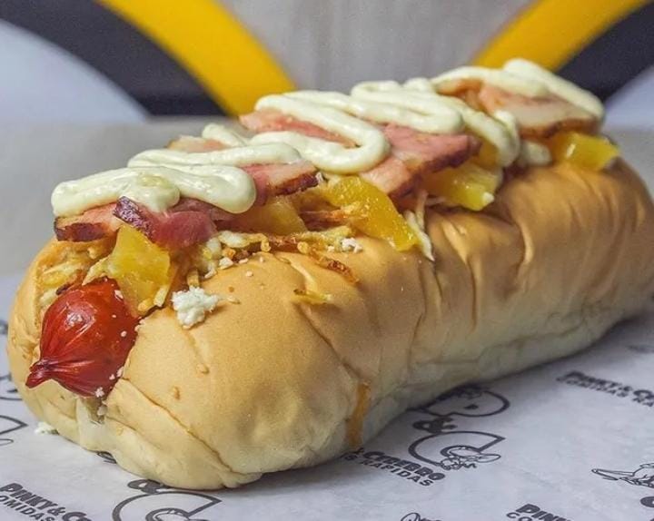 Perro caliente con salchicha tradicional, pan, papa ripio, lechuga, queso costeño, salsa tartara, salsa piña, queso mozarella y tocineta.