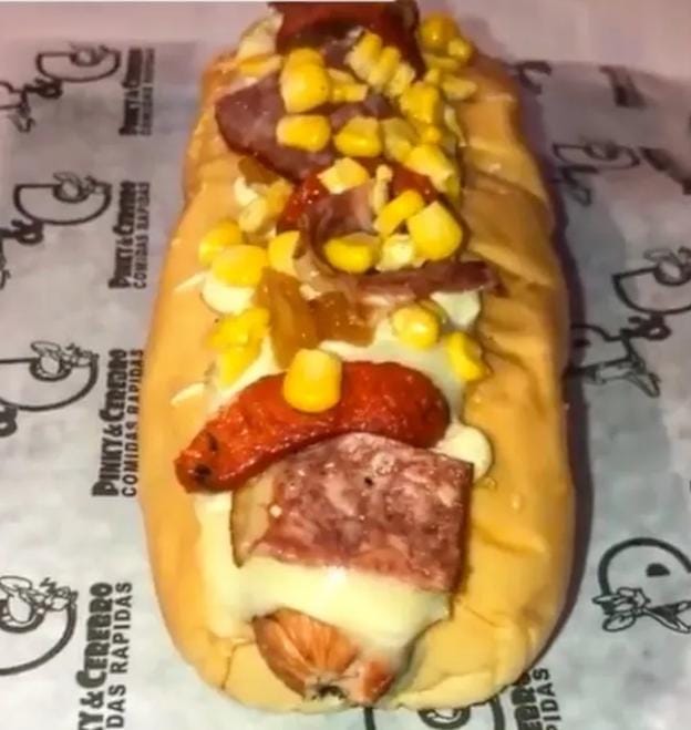 Perro caliente con salchicha tradicional, pan, papa ripio, lechuga, queso costeño, salsa tartara, salsa piña, pollo, carne, chorizo, butifarra y queso mozarella.