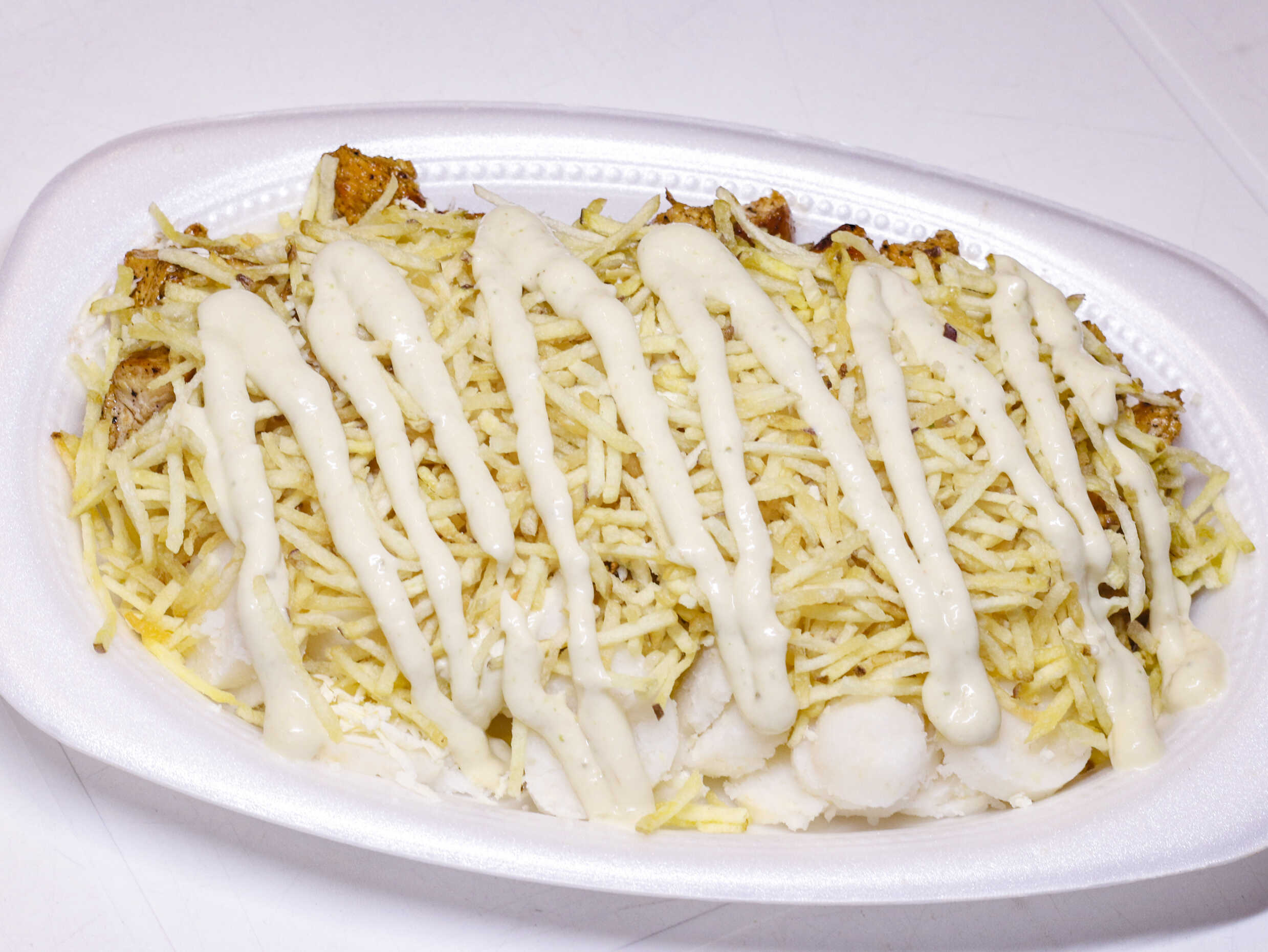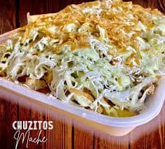 Maíz, pollo en trozos, queso costeño, lechuga, salsa tartara y salsa piña.