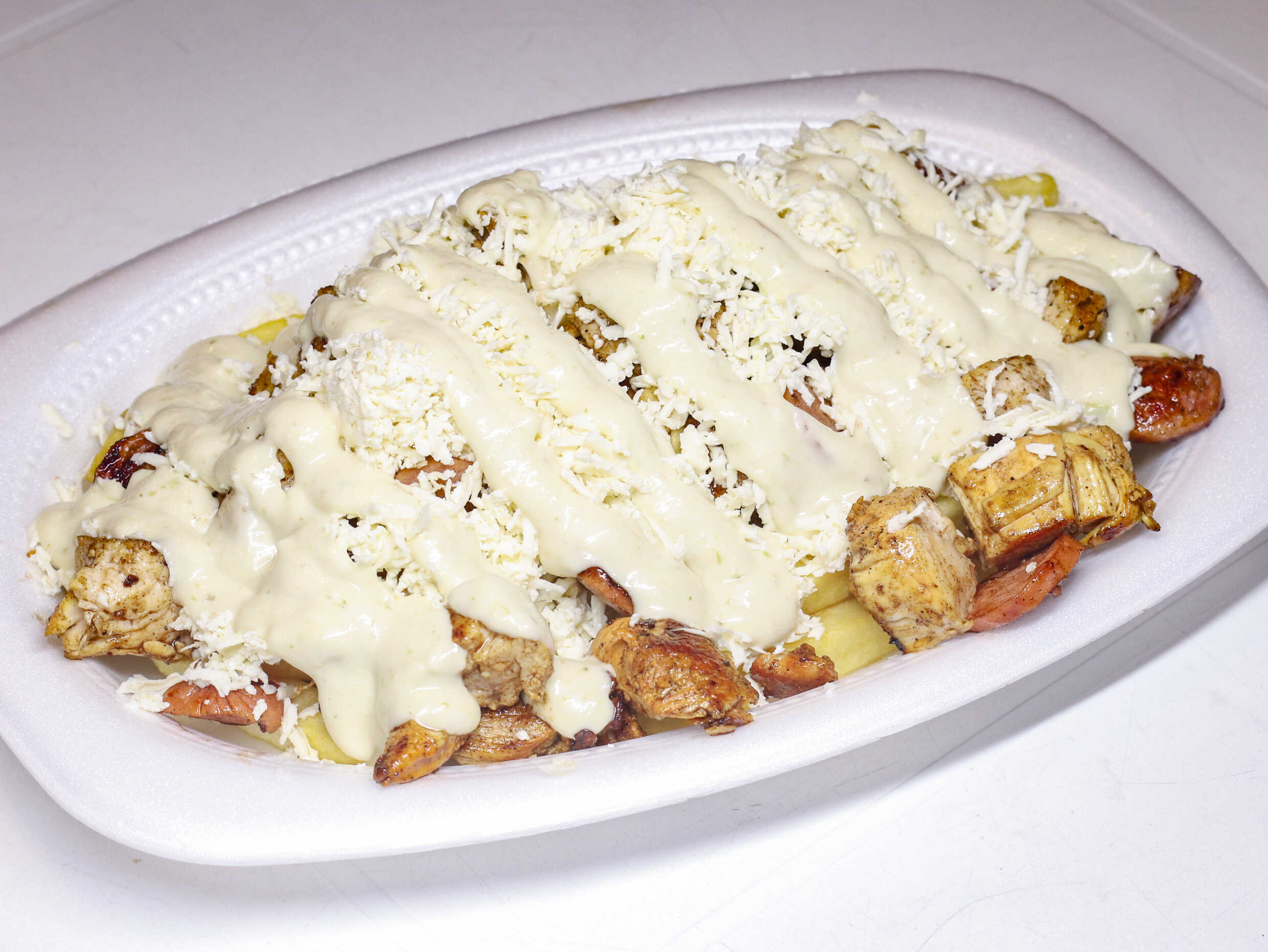 Papas francesa, salchicha tradicional, chorizo, pollo, carne, butifarra, queso costeño, lechuga, salsa tartara y salsa piña.