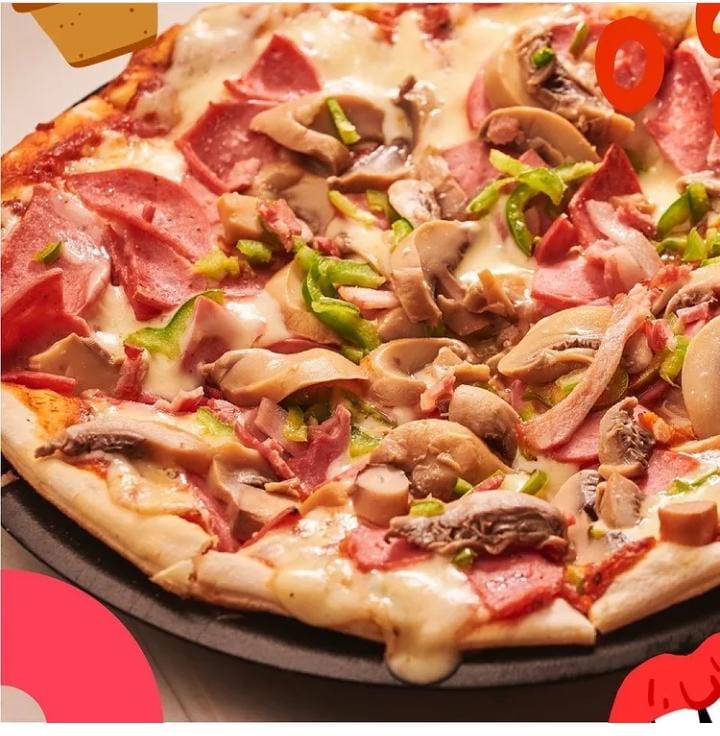 Tocineta, salami, pimentón y champiñones.