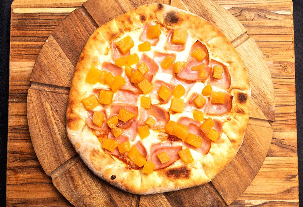 Masa italiana, cubierta en salsa pomodoro de la casa, una capa de queso mozzarella bajo en grasa, jamón, piña y tamaño a elección.