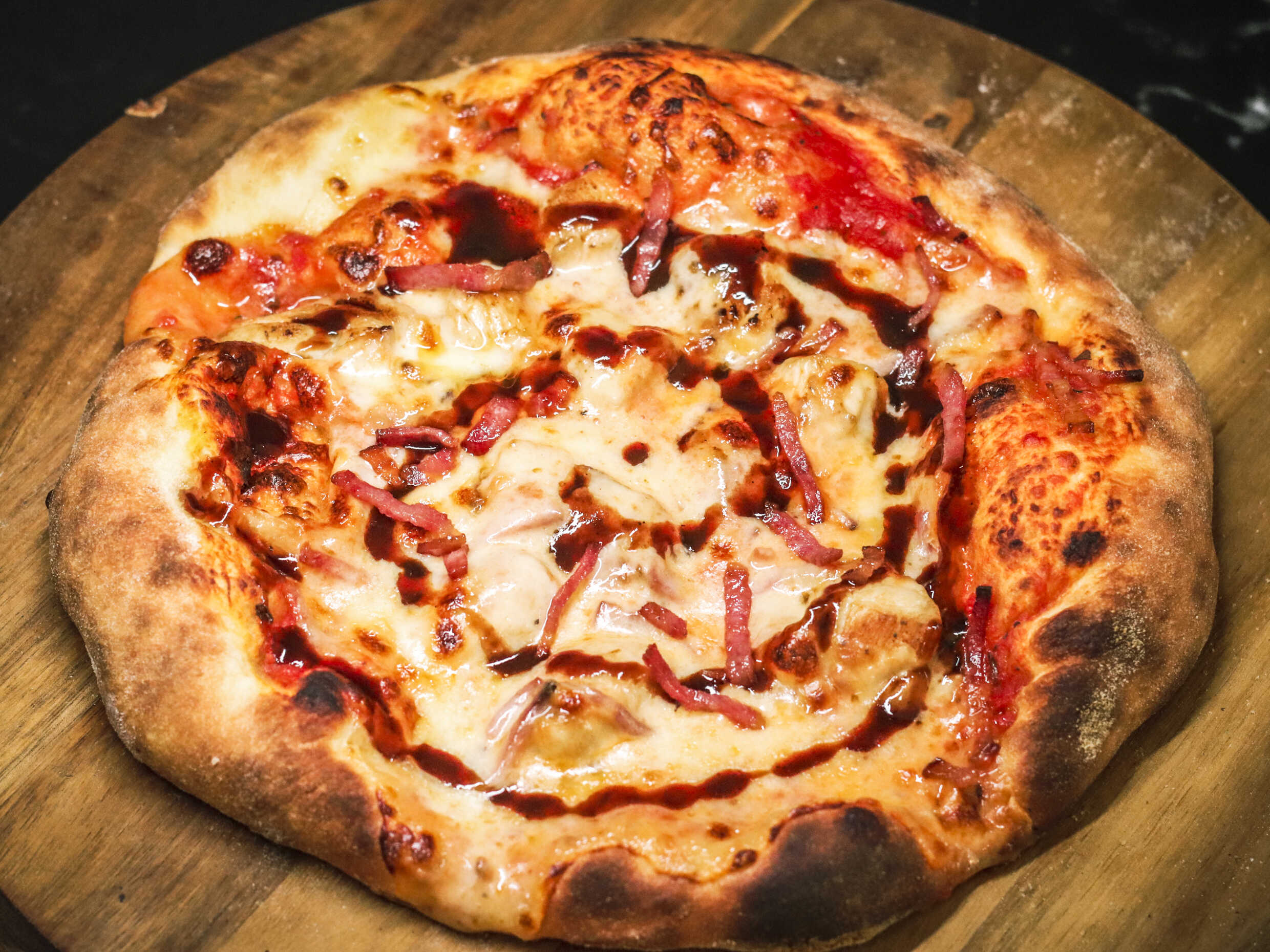 Pizza con queso mozzarella, salsa napolitana, pollo en trocitos, tocineta y salsa BBQ con bebida a elección.