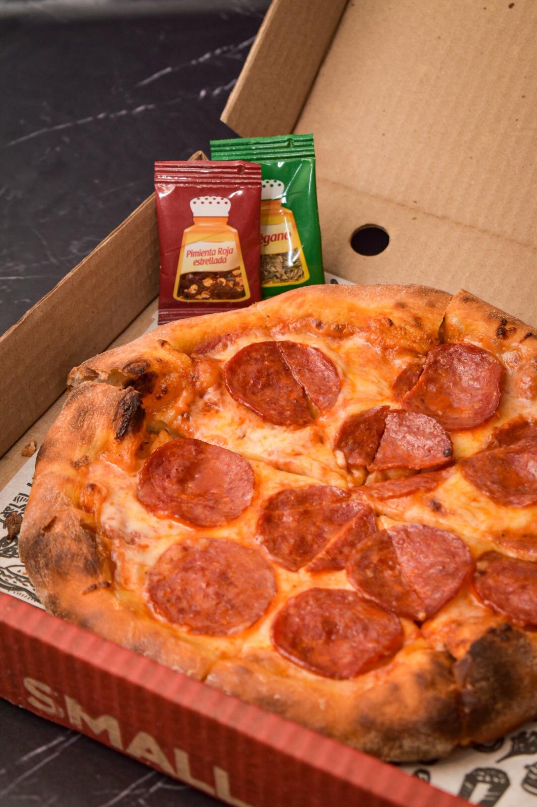 Masa italiana, cubierta en salsa pomodoro de la casa, una capa de queso mozzarella bajo en grasa pepperoni americano y tamaño a elección.