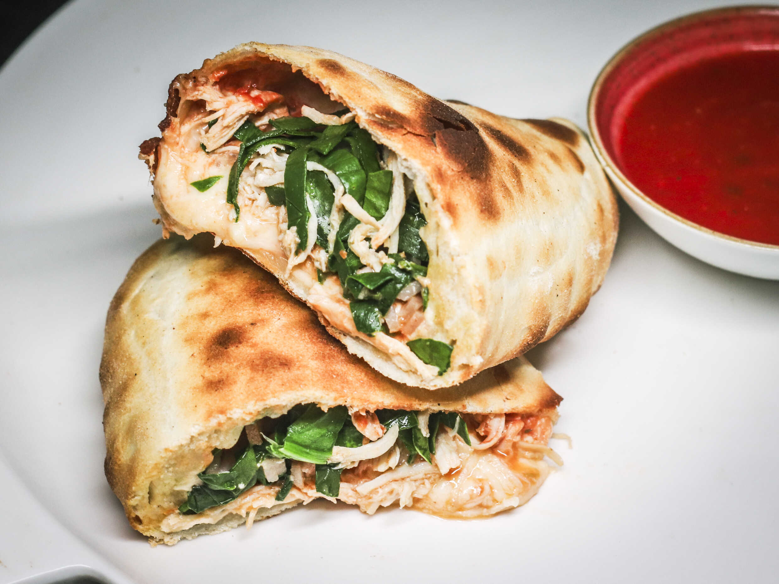 Calzone en salsa bechamel, queso mozzarella, espinaca, pollo y tocineta.
