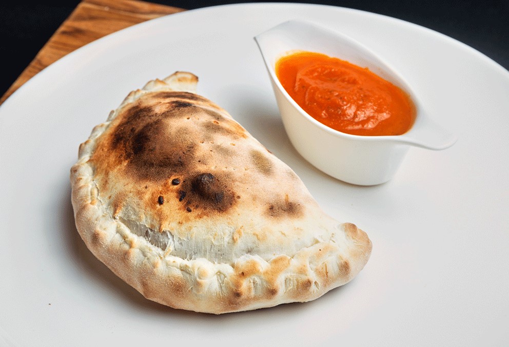 Calzone en salsa napolitana, queso mozzarella y pepperoni.