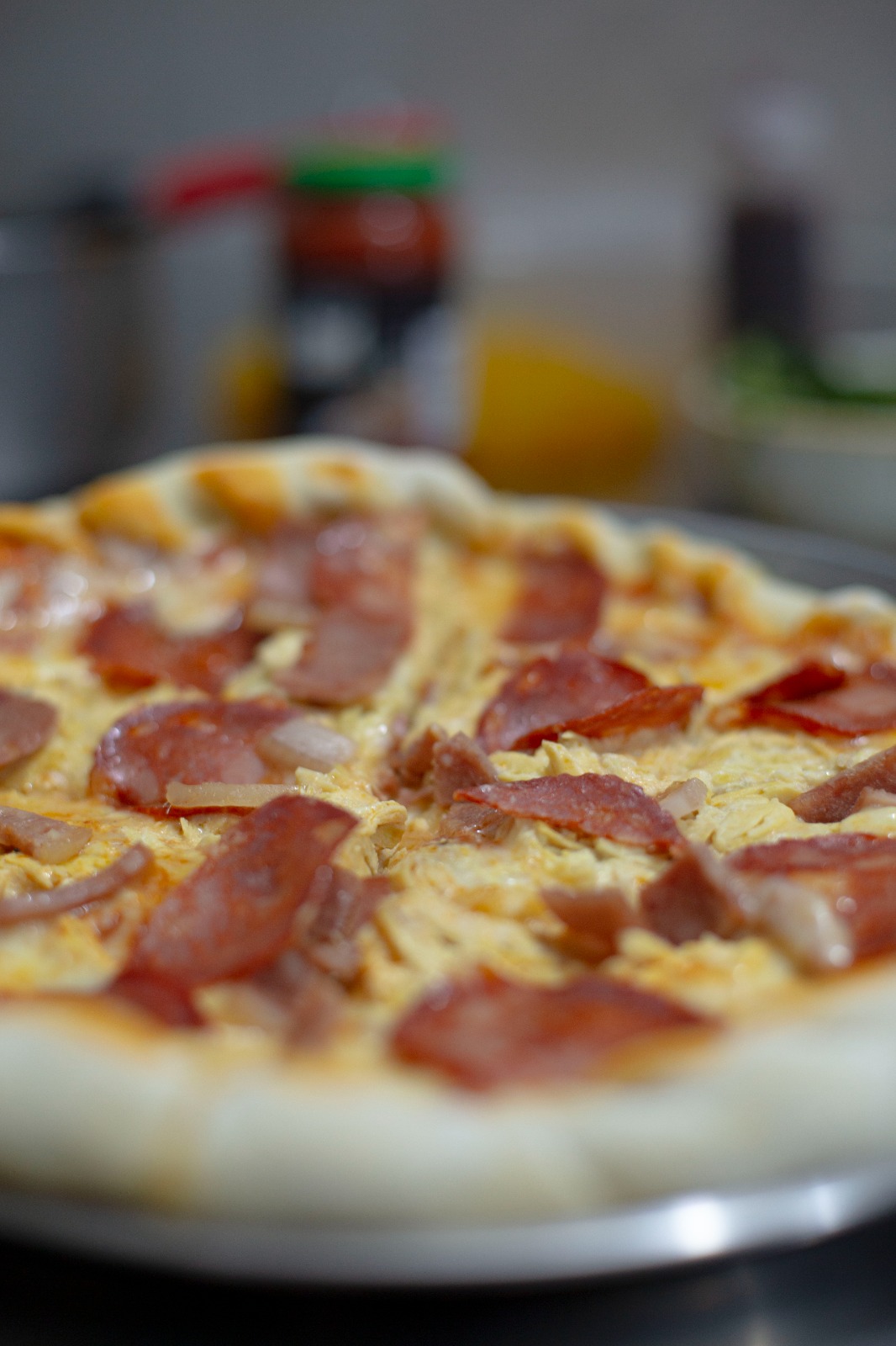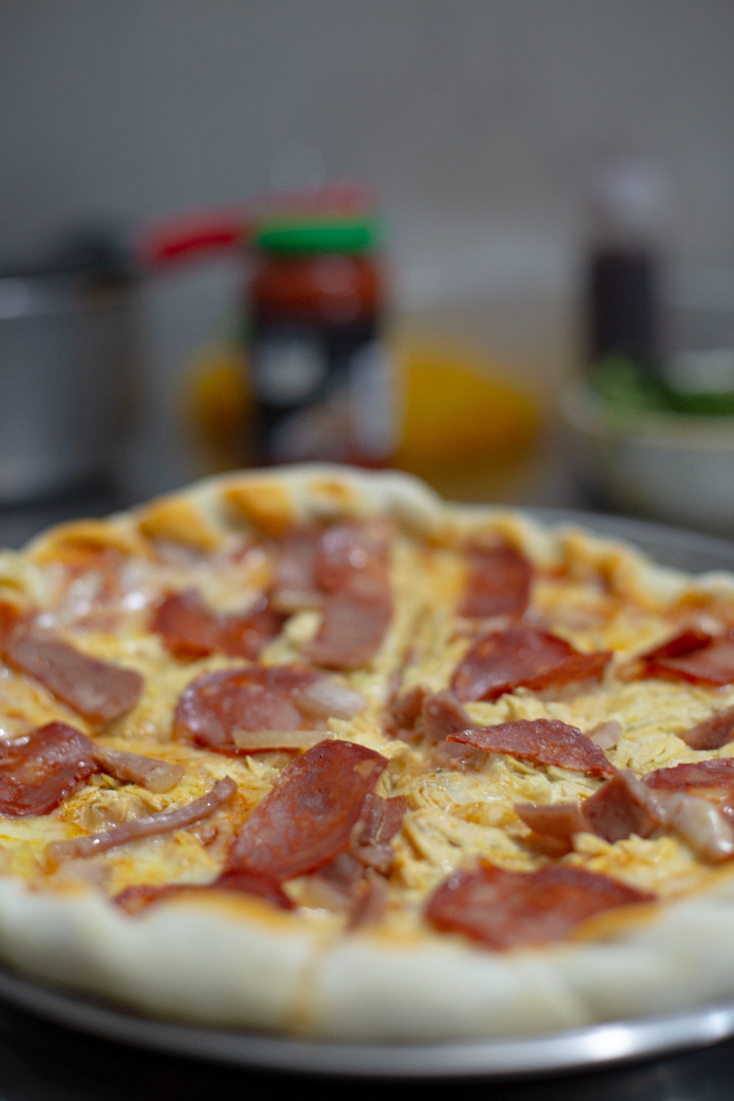 Salsa pomodoro, queso mozzarella, pollo desmechado en bechamel, salami, maíz y salsa BBQ.