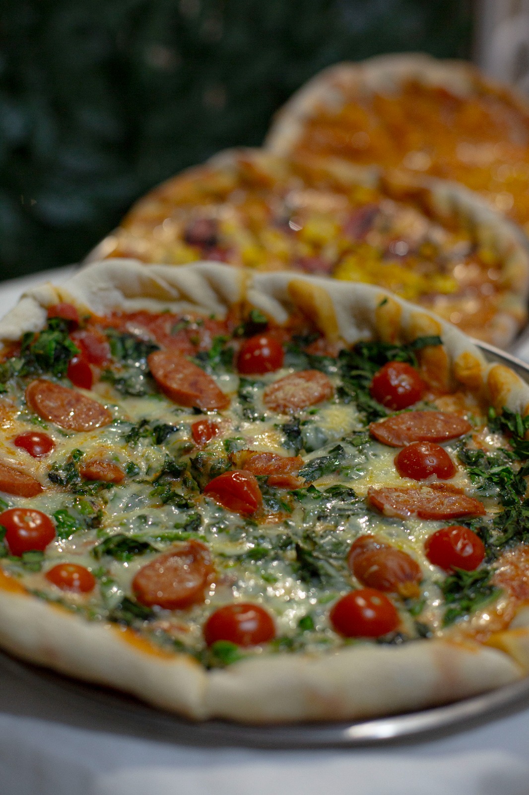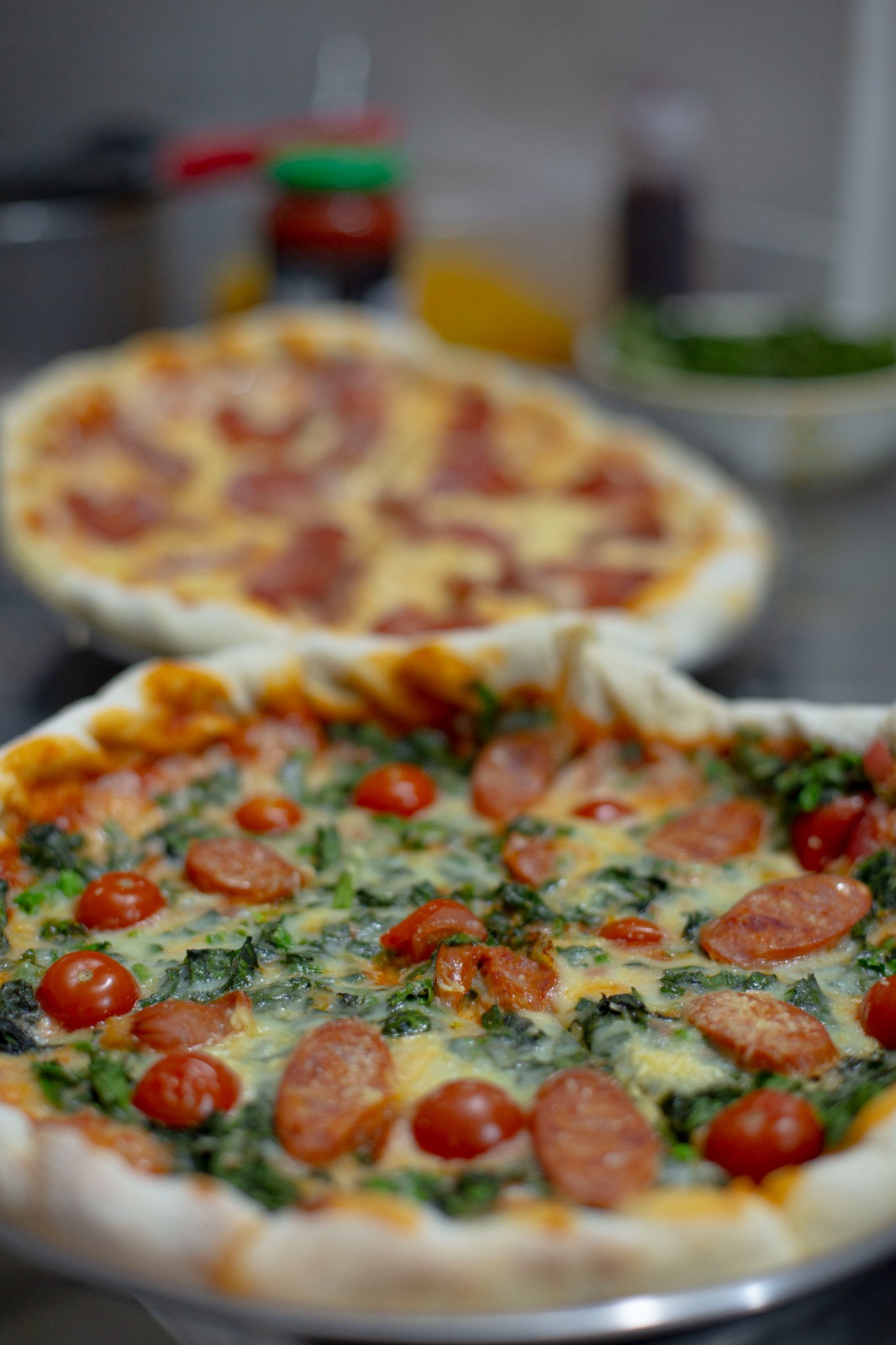Salsa pomodoro, queso mozzarella, tomate cherry, chorizo ternera, espinacas, queso parmesano.