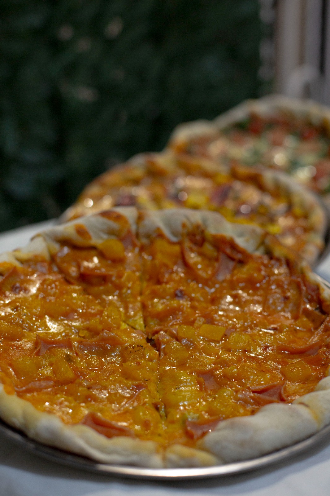 Salsa pomodoro, queso mozzarella, jamón, piña en trocitos.