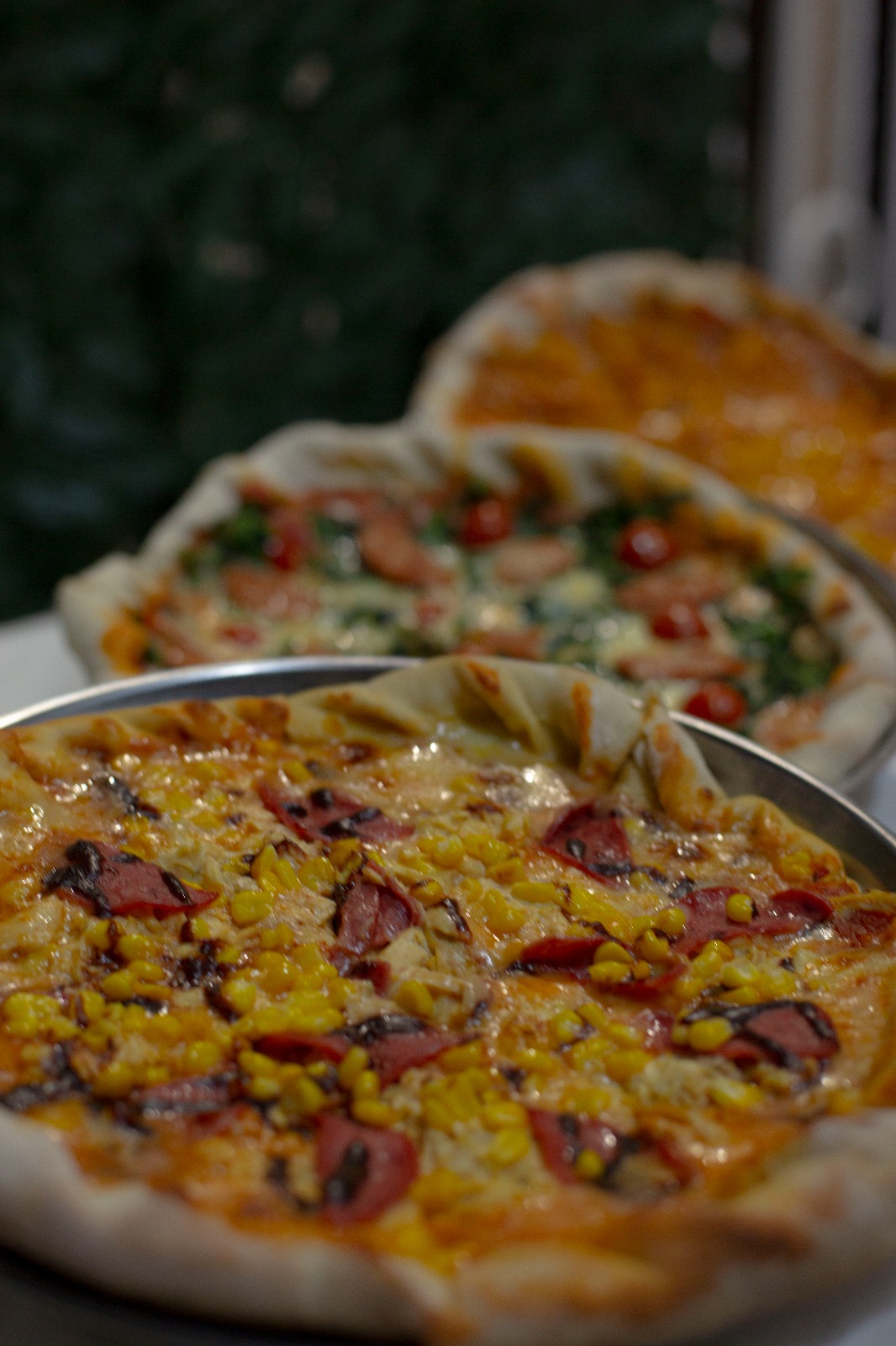 Pan de 30 cm, doble salchicha americana, pollo y carne en cubo, cebolla caramelizada, papa chongo, queso mozzarella, jamón, tocineta, piña en trocitos, salsa tártara.