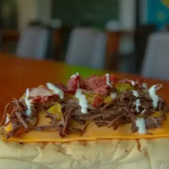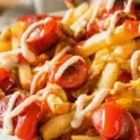 Papa a la francesa, salchicha americana, pollo desmenuzado en tártara, carne desmenuzada en BBQ, Papa chongo, queso mozzarella fundido, maíz, chips de tocineta, salsa tártara, piña en trocitos.